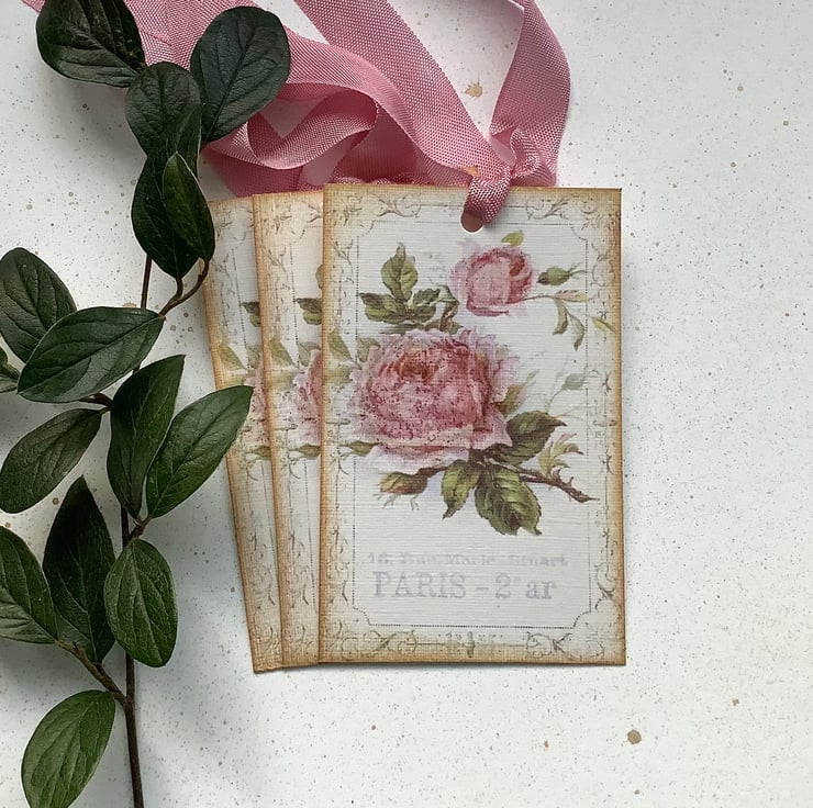 Lovely vintage rose image on a Paris themed background and border. . I have printed on to high quality linen-look (285gsm) card . Of course there has to some shimmer! and so I have added the necessary ink and glitter .Finished with lovely ,silky ,vintage -style ribbon .
