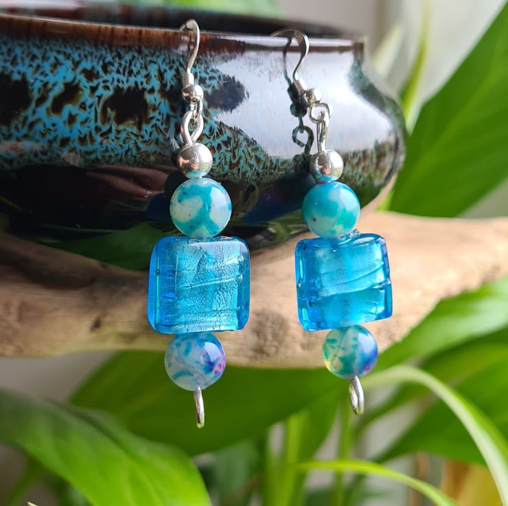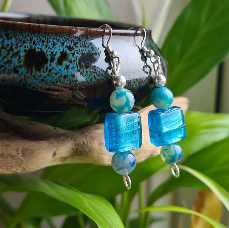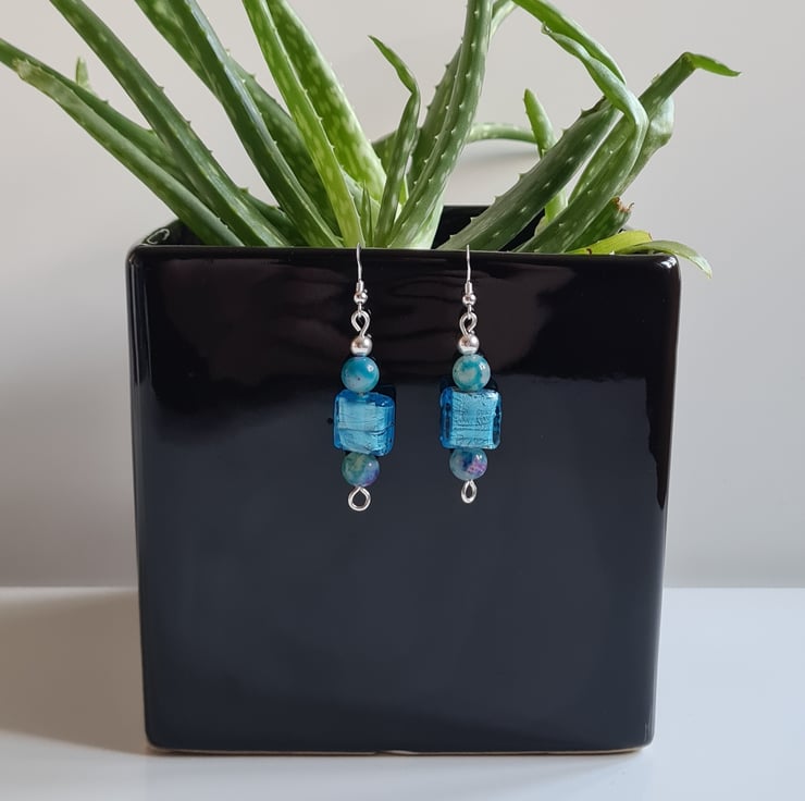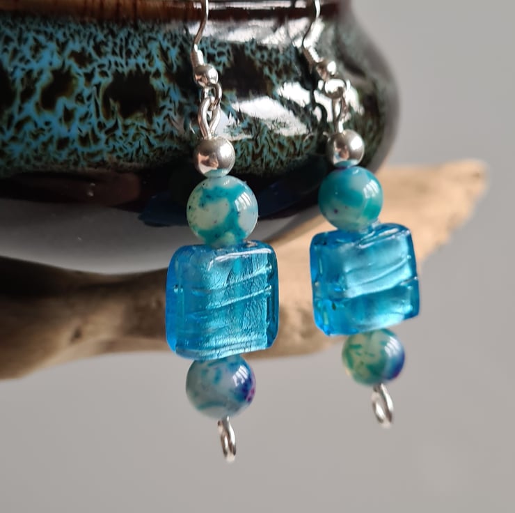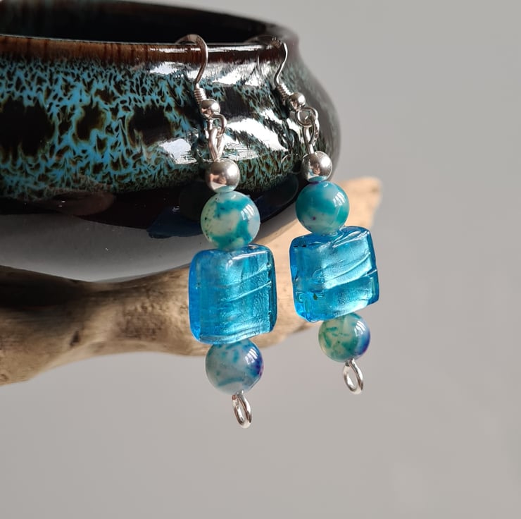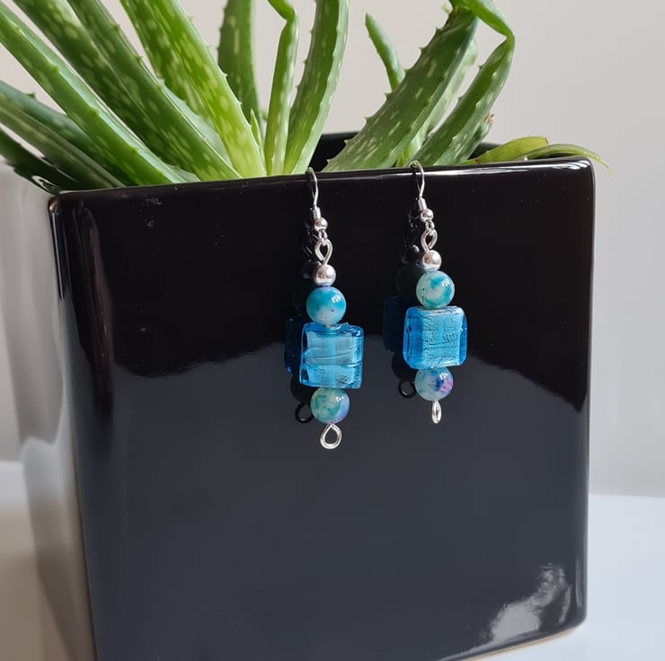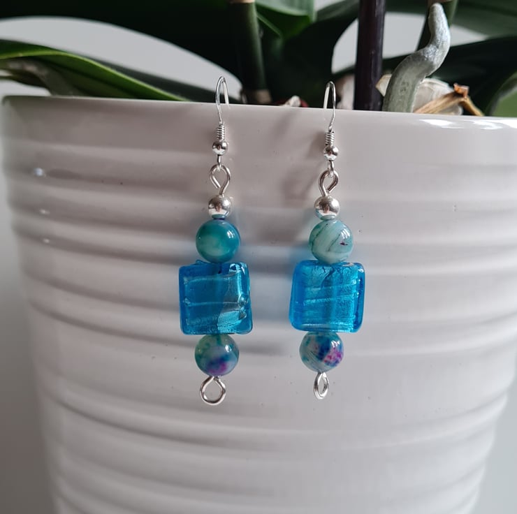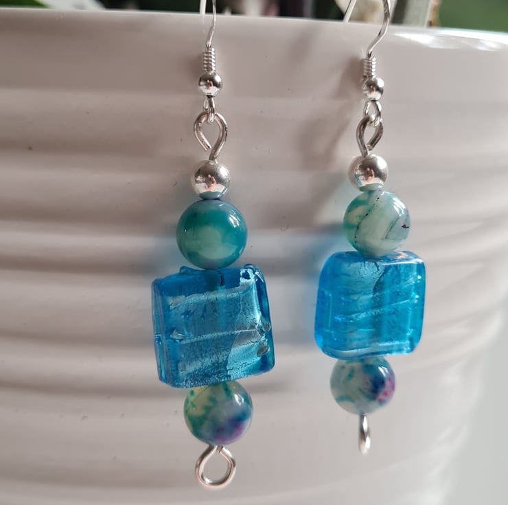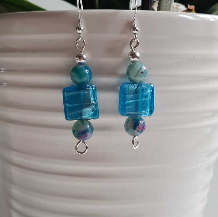 I have made these very cute and funky earrings entirely from 925 Silver and these really bright Square Glass Beads. Finishing with Natural (dyed) Agate Beads that are multicoloured and Sterling Silver beads on 925 silver ear bars.