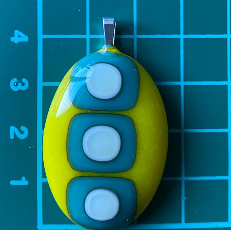 This lovely vibrant pendant was made with hand crushed yellow glass, with added teal square cut glass and pre-fired French Vanilla glass dots. The chemicals in the glass react when placed with other reactive glasses, creating the coloured outlines which add to the design. It was moulded at 800 degrees Celsius to create one solid oval piece of glass. Once cooled a silver plated jewellery bail was added so it can be hung on a choice of black cord or silver plated snake chain.