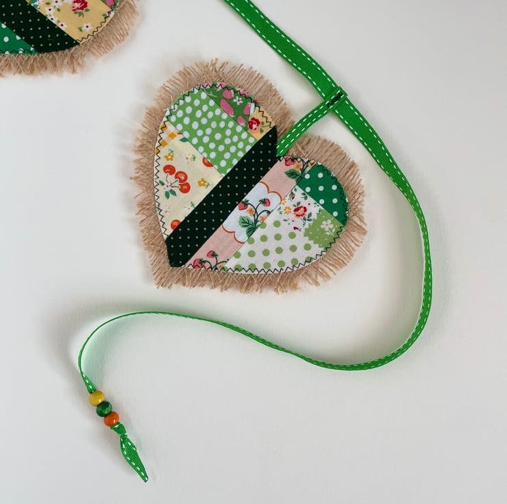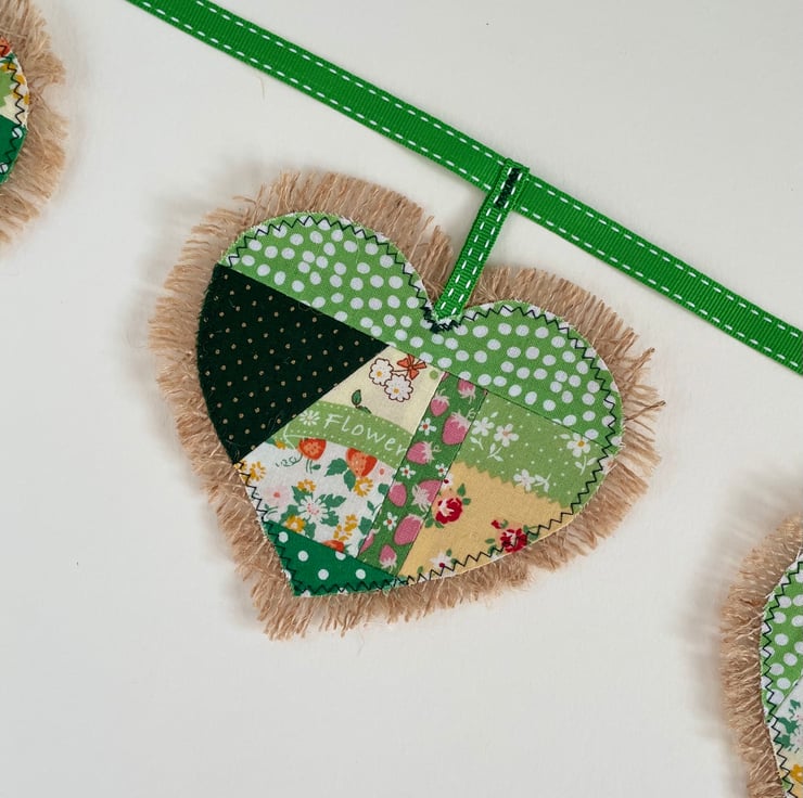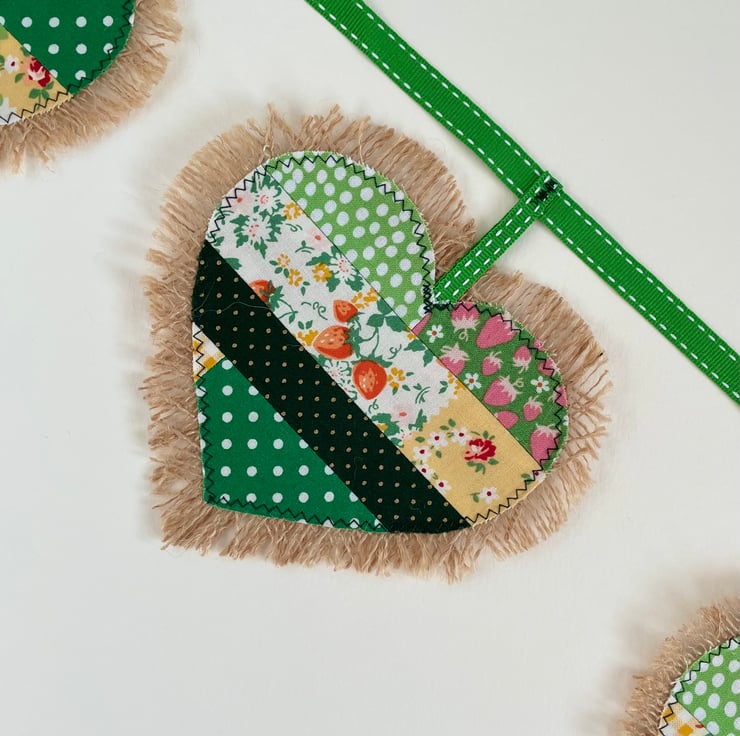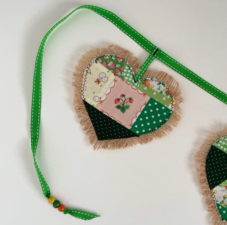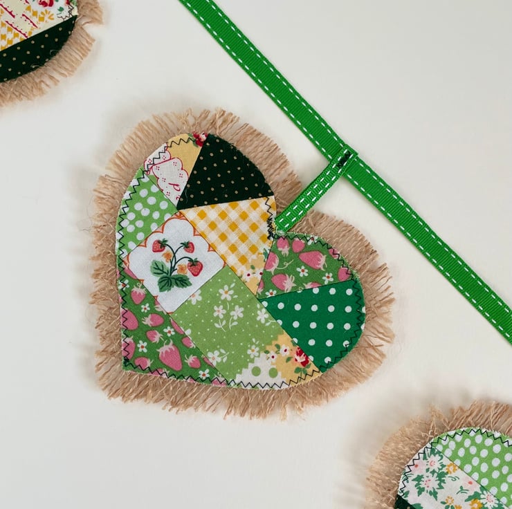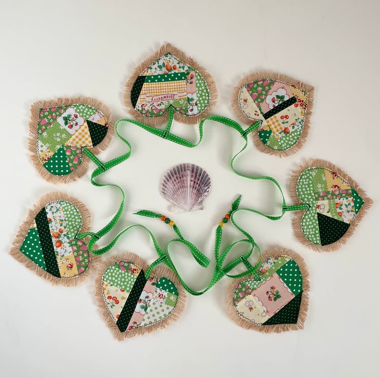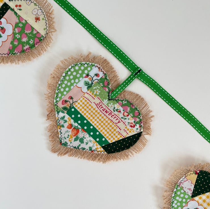 Cute bunting made from 7 hearts on a hessian with a cute strawberry design. Each heart is different. 186 cm from long one end to the other. One sided.