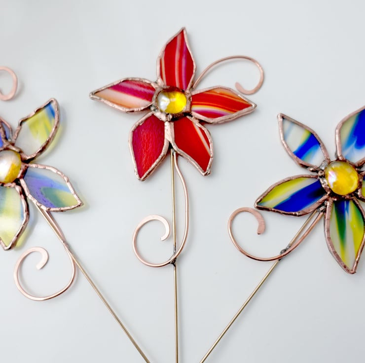 Each flower is hand crafted using a mix of rare and unusual glass with a centre glass jewel and the copper detail is hand beaten 100 percent pure copper. Colours and shades may vary from those shown if I don't have them in stock.