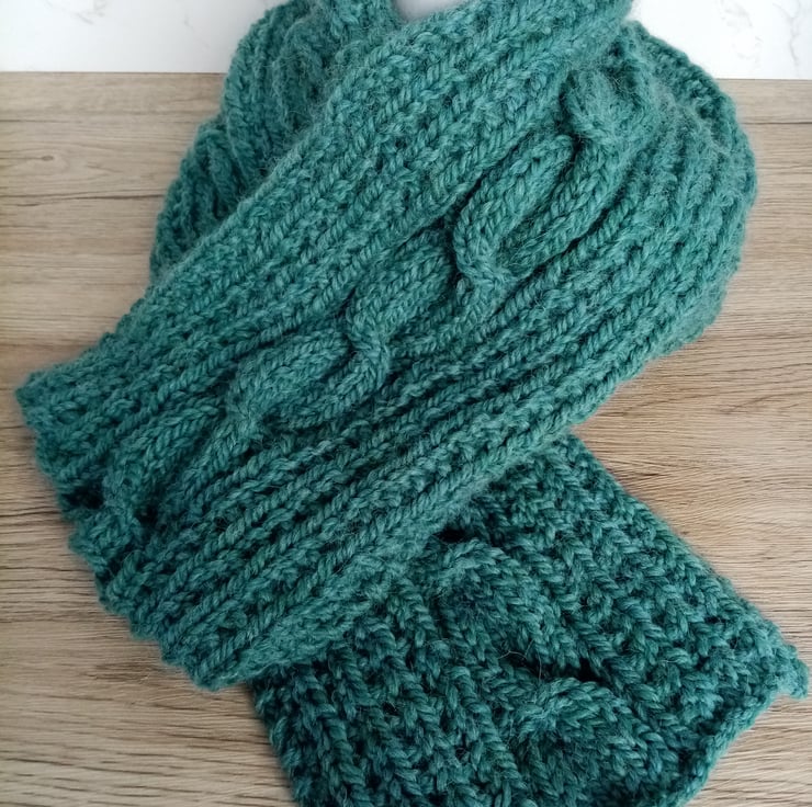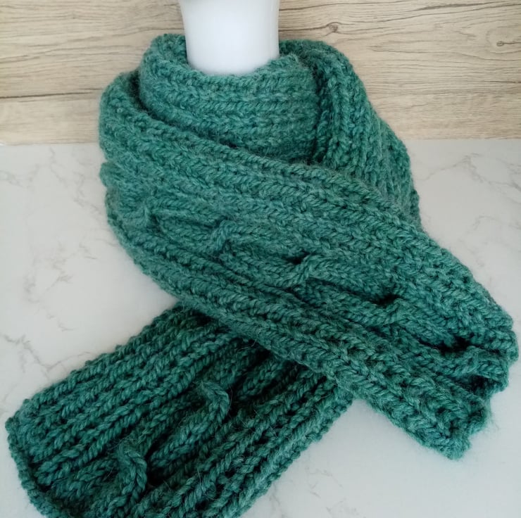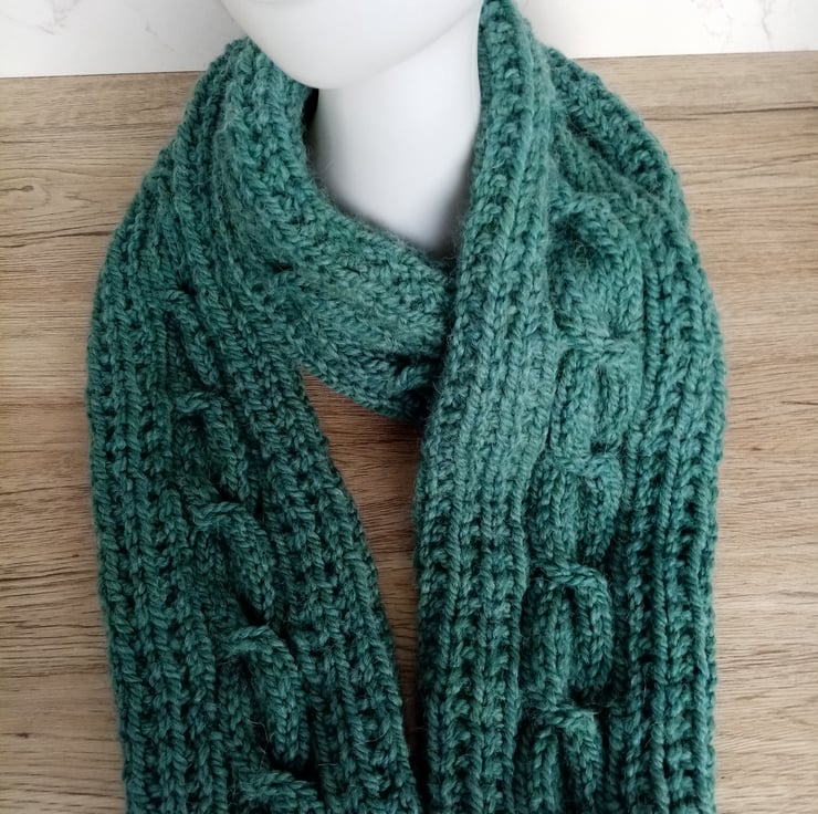 This cable knit wrap-around scarf in sea green is made from a soft and chunky blend of Alpaca and wool from the Peruvian Andes region.
