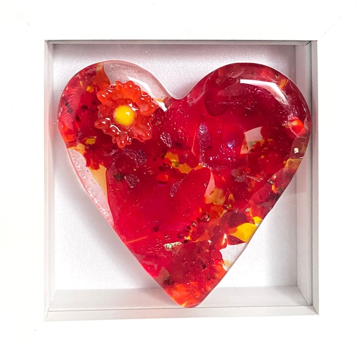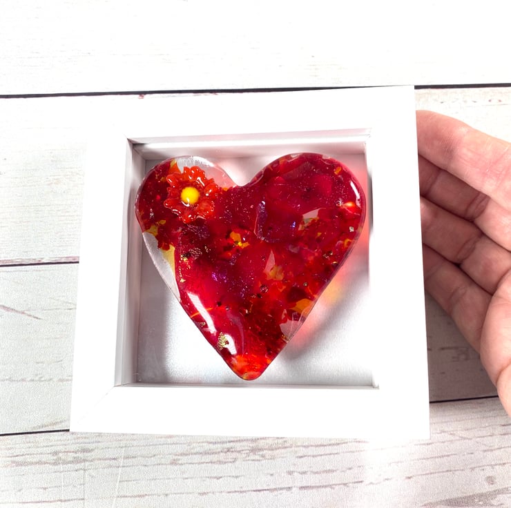 Stunning one of a kind fused glass red heart with iridescent glass and fired for a second time to add a glass flower . This 12 cm glass frame can be wall hung or freestanding.