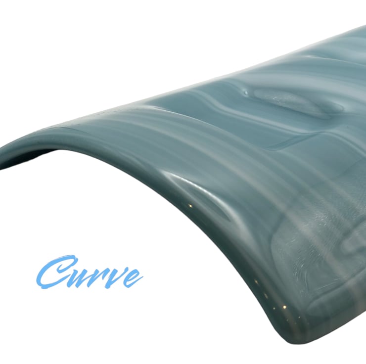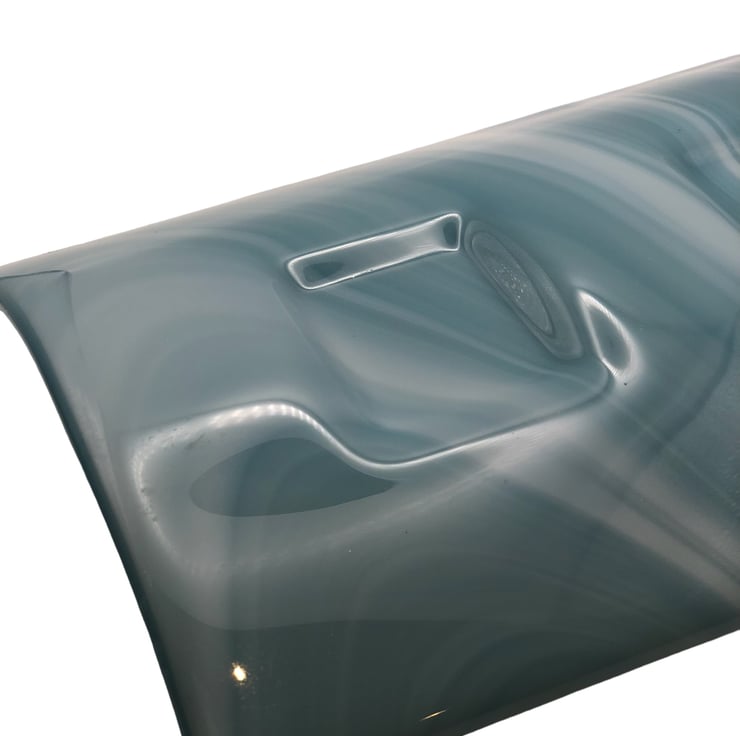 The glass is a pale warm blue with paler blue swirls within in and has a plain blue back (two layers of glass). The holder is slightly curved to elevate the candles.