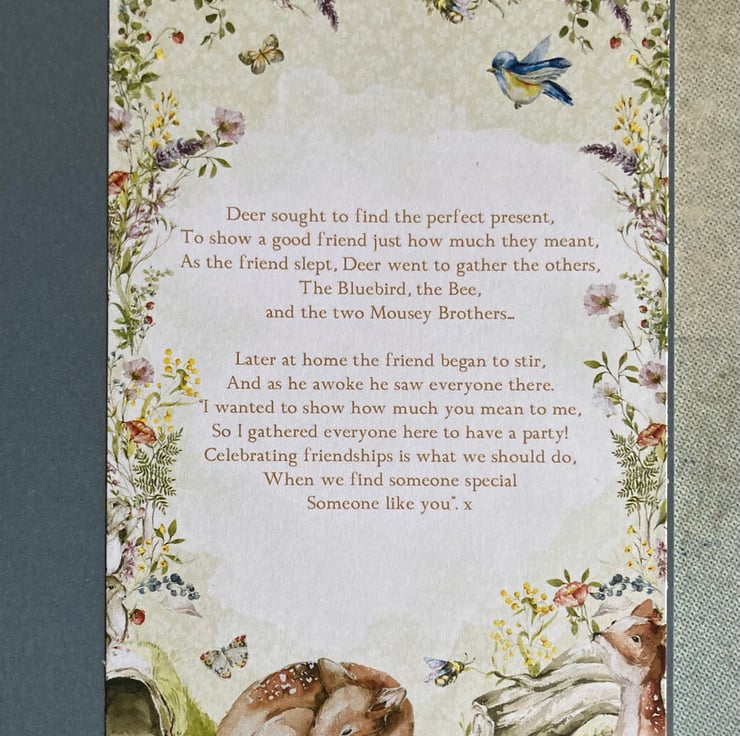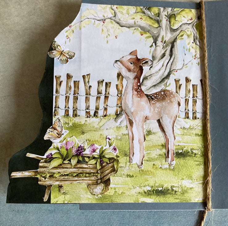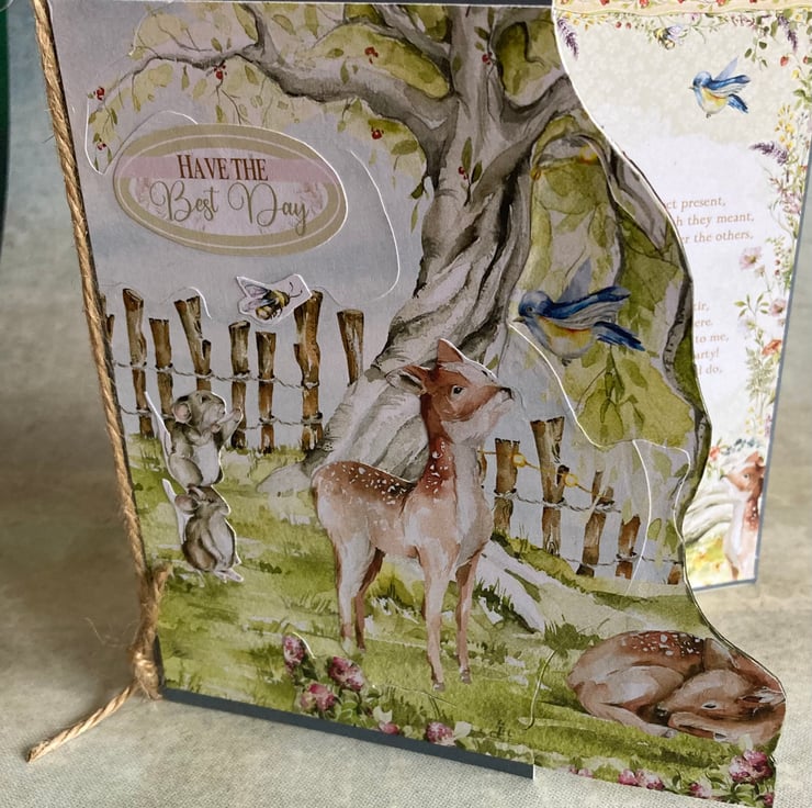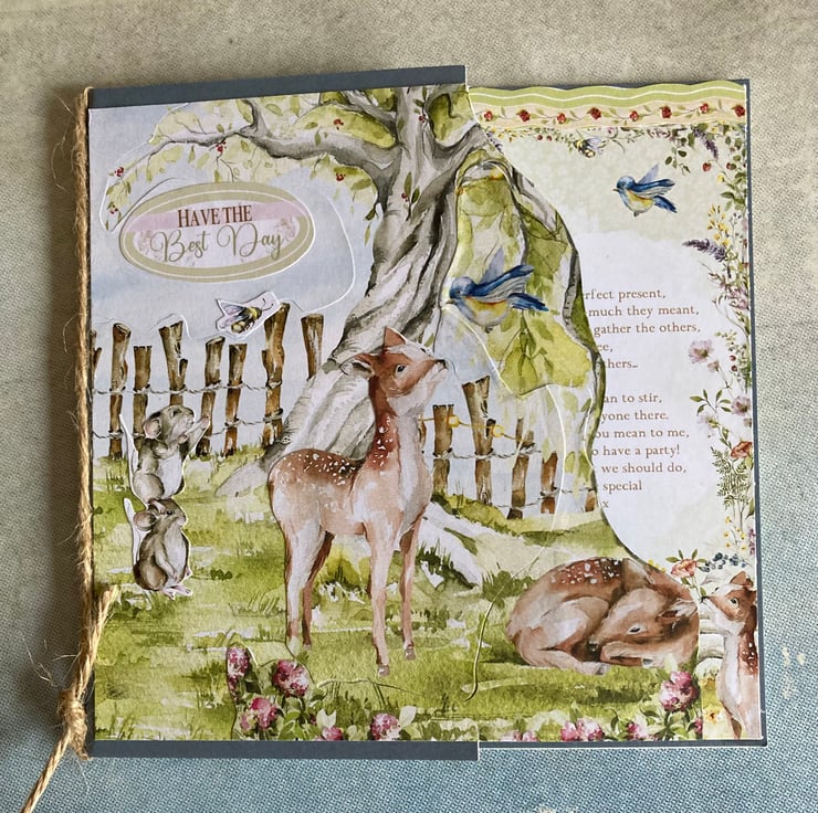 Inside the card has been decorated with a fussy cut decoupage picture of Deer, butterflies and a cart filled with flowers. The story of the friends search for the perfect gift finishes the card.