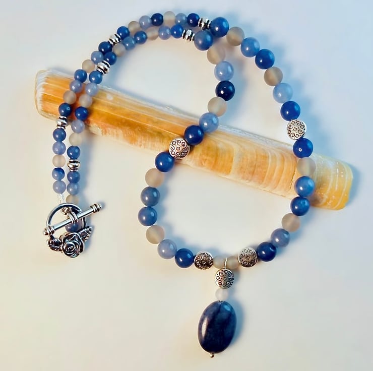 The body of the necklace is made of 6mm and 4mm Blue Aventurine beads in gorgeous shades of pale-to-dark. smoky blues.