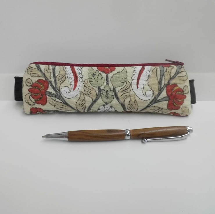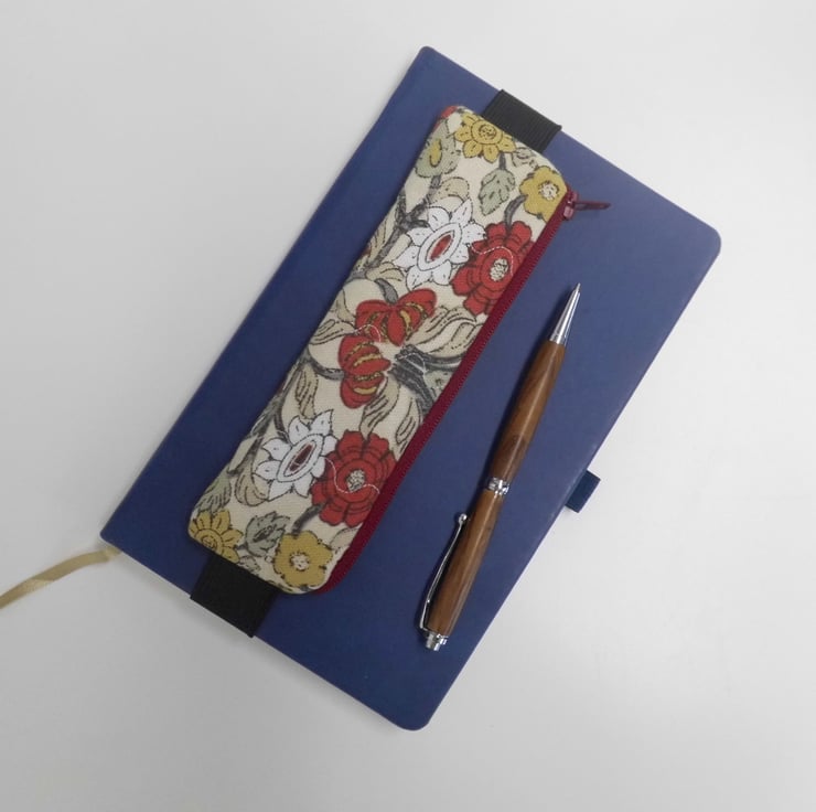 It has a dark red zip across the top. The elastic is black and 23mm wide. The pencil case measures about 17.5 cm x 5 cm and I have shown it here on the cover of a book 21cm tall and it fits perfectly, although because it's elastic it will fit a book perhaps a couple of centimetres bigger.