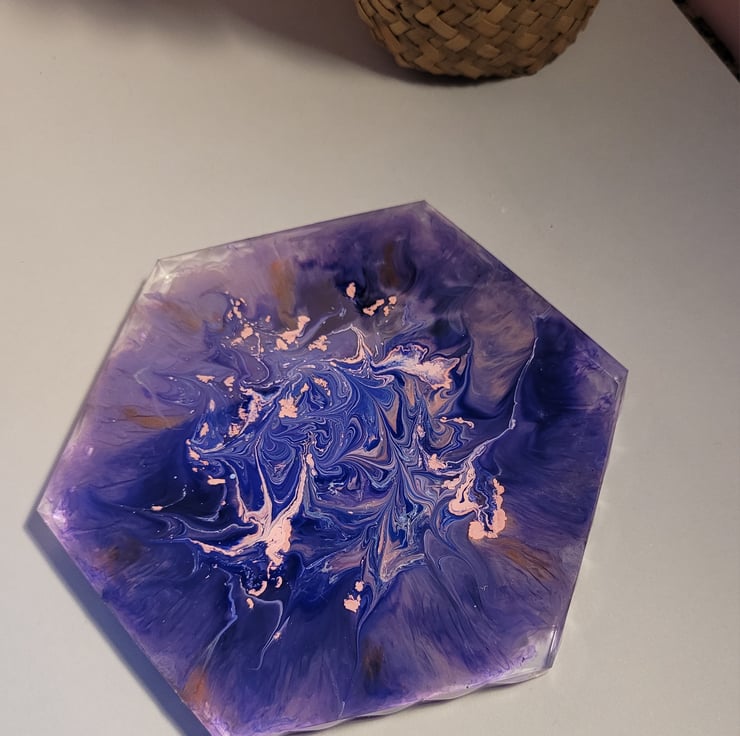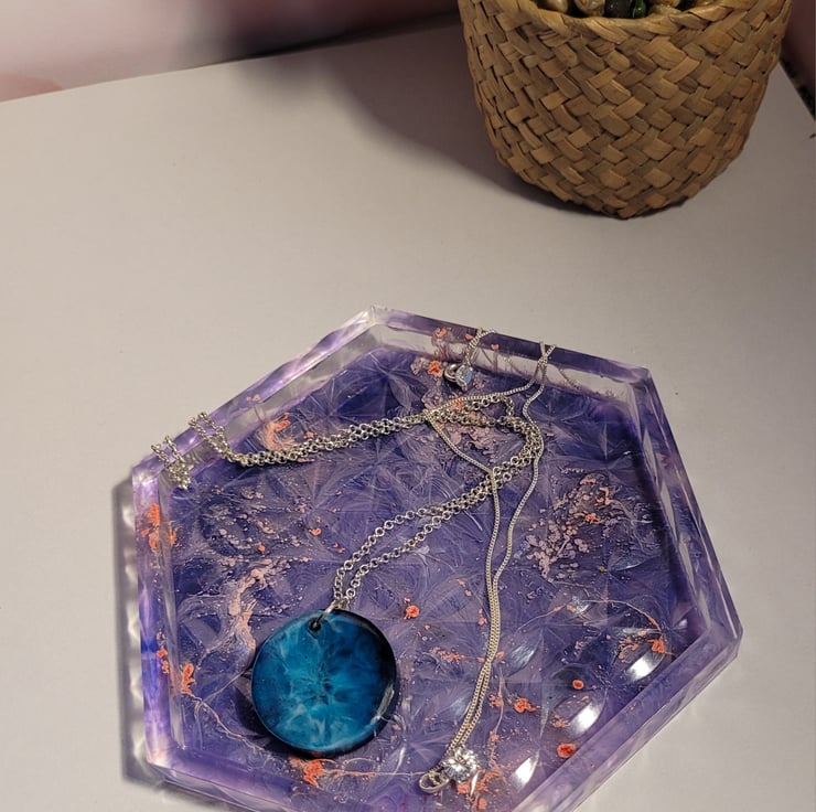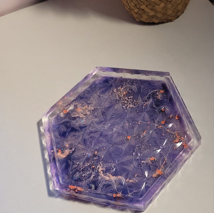 a hexagonal purple resin trinket, jewellery dish. An ideal addition to a dressing table.
