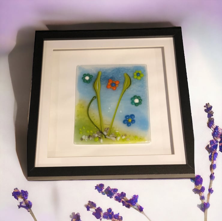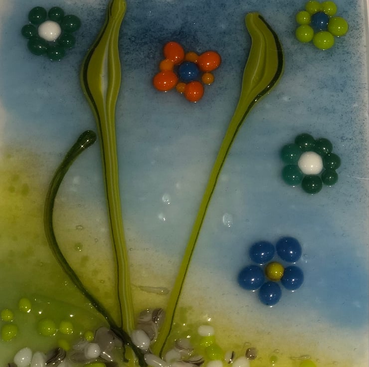 Framed picture of abstract spring flowers created using fused glass.