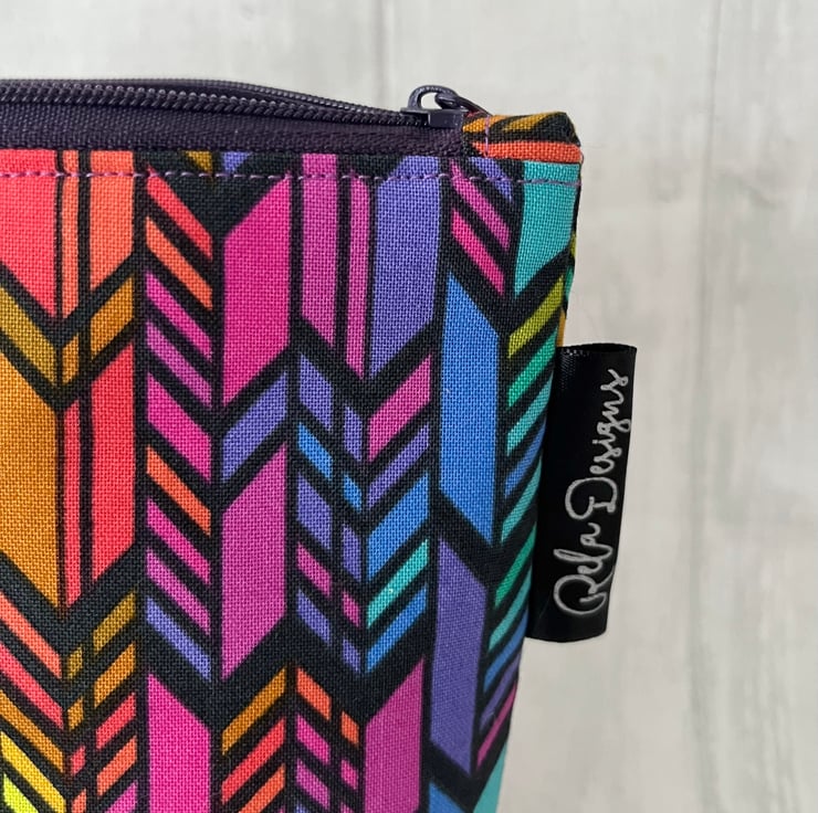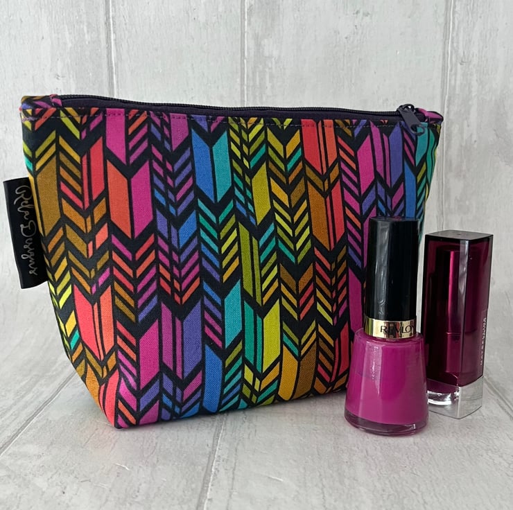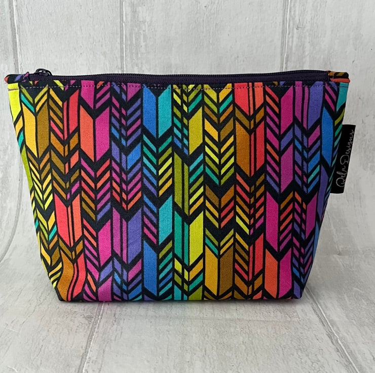 This colourful print cotton zipped pouch has a purple waterproof nylon lining , great for those inevitable spills.