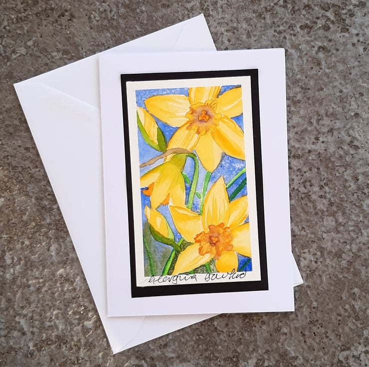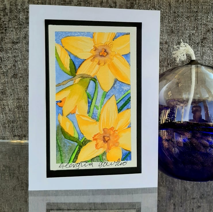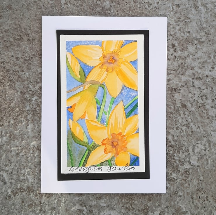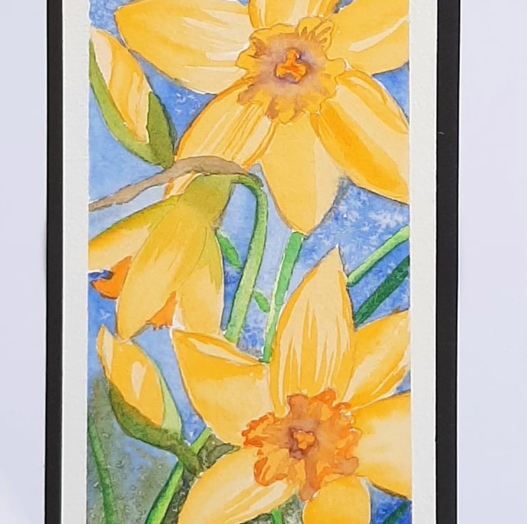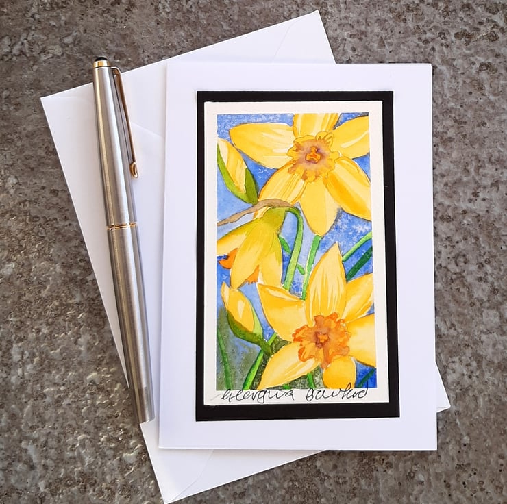 Handpainted Watercolour, mounted onto black paper then white Card. The card is slightly thinner than my square cut card.