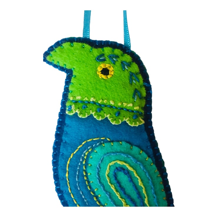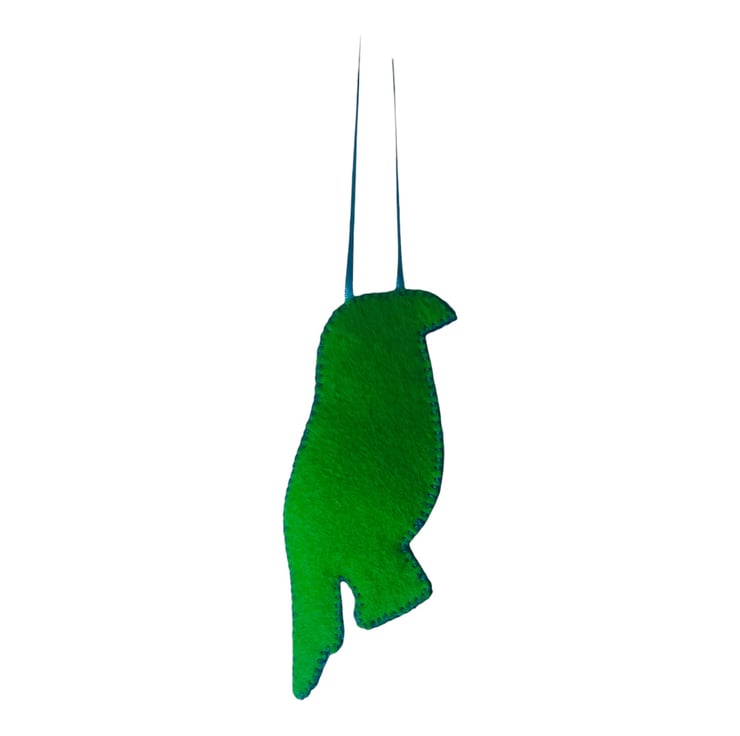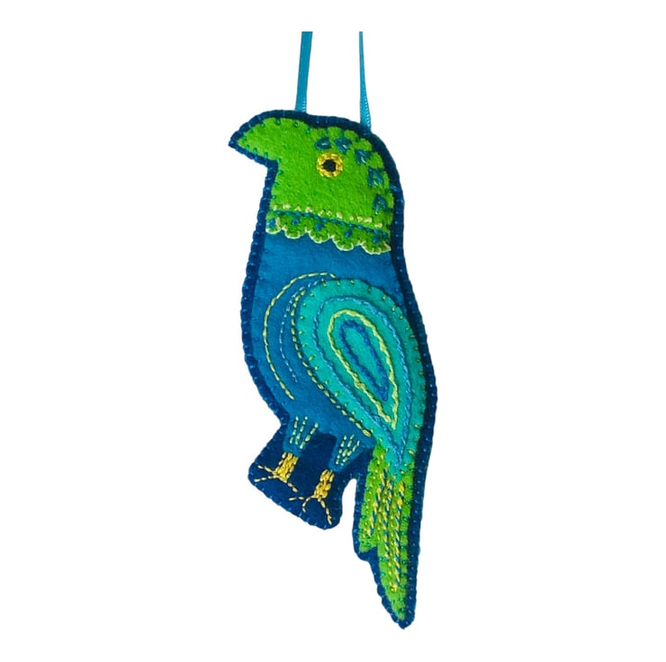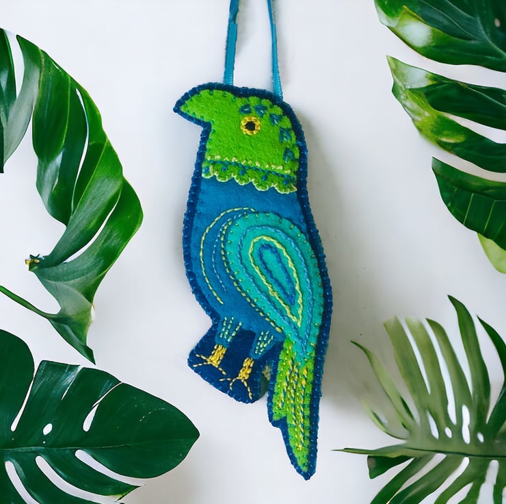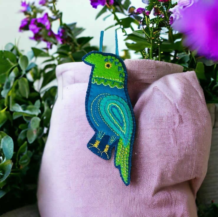 This cheeky eco friendly parrot is made from 100% wool felt and cotton thread. His vivid green and blue colours really pop out at you! He is richly embroidered in the Folk Art style and is green on the reverse side..