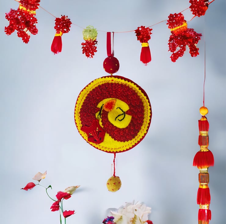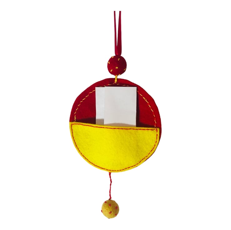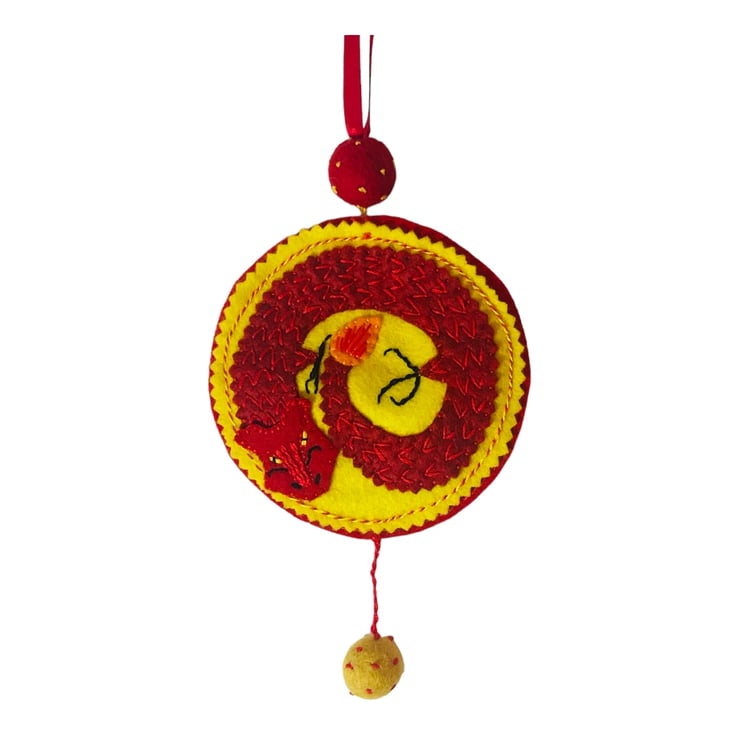 This beautifully appliqued and embroidered pure wool hanging decoration depicts the wood dragon, the lucky animal for this Lunar New Year which begins this year on Saturday 10th February. I have used red and yellow the traditional colours of this festival. Yellow and red embroidered balls add to the interest of this truly unique piece.