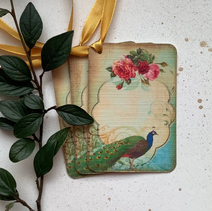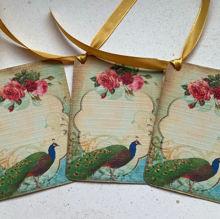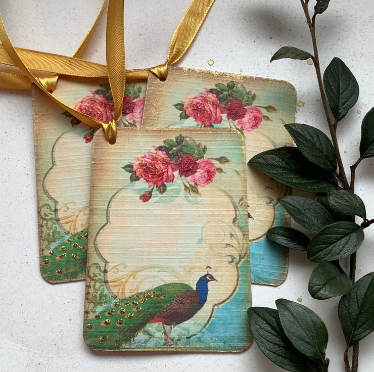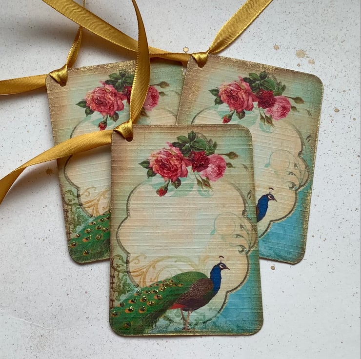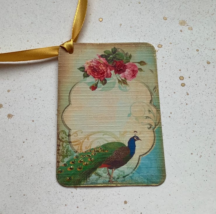 COLOUR ; Gren / blue peacock , pink Roses on a sepia toned background . The tag edges have been 'aged' with gold ink .Tied with gold ribbon .