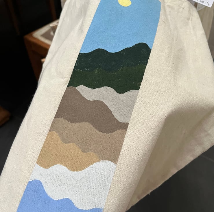 These cotton tote bags are hand-painted with acrylic paints. This unique, one of a kind design is inspired by Seaton beach in Devon. It is one of multiple designs - take a look at my shop page to find others that are available.