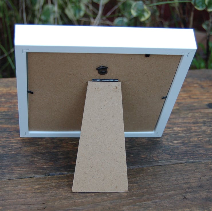 It is framed without glass in a new white wood box frame measuring 12 cms square.
