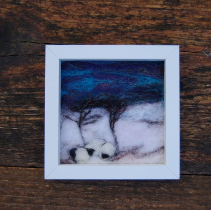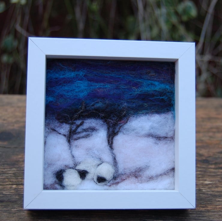 Needle felted wool fibres on vintage wool blanket and embellished with hand embroidery. It shows three sheep sheltering beneath trees in a snowy landscape.