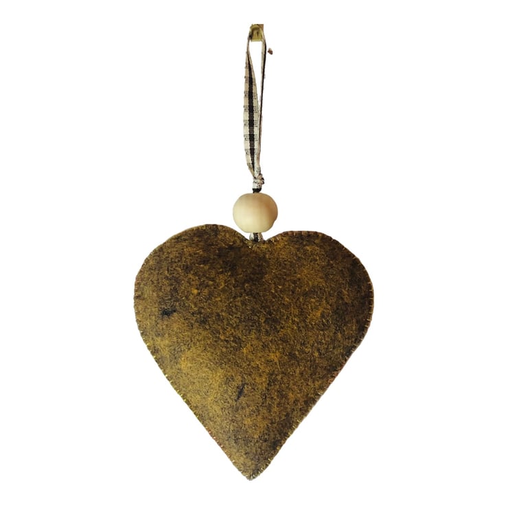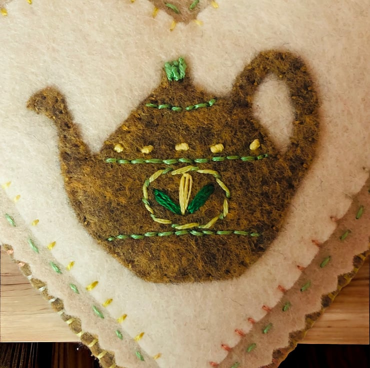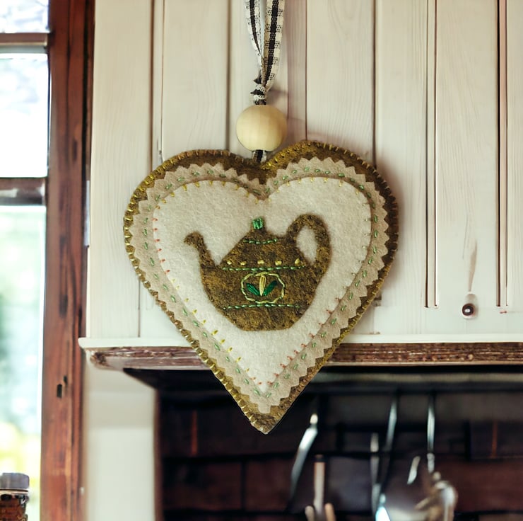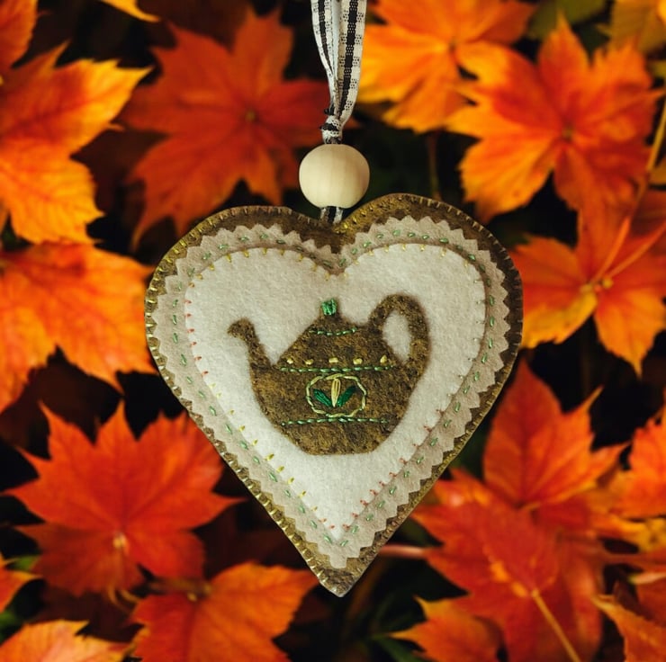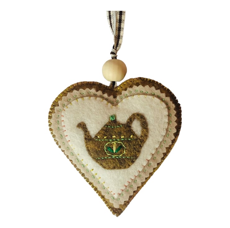 The teapot on this heart says ' Let's have a nice cup of tea' A perfect gift for someone who just loves a cuupa! This heart is appliqued in three layers of felt and has an embroidered teapot on the front. I have attached a wooden bead and and used gingham ribbon so that this decoration can be hung anywhere ! It is stuffed with tiny felt off cuts making this make totally eco friendly and made from only natural products.