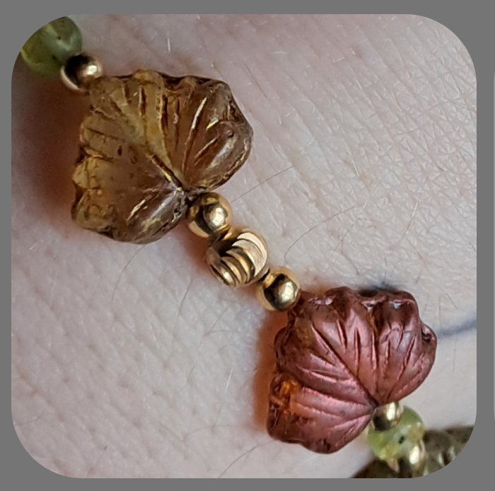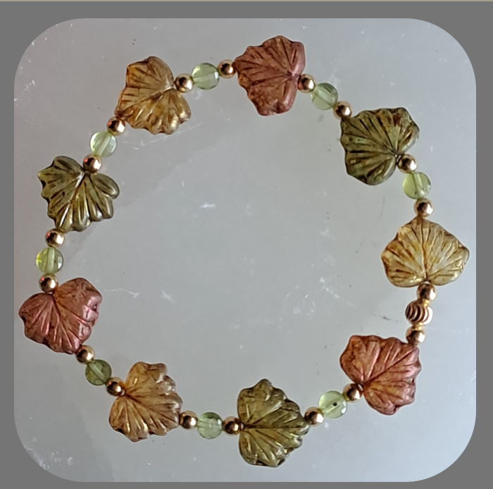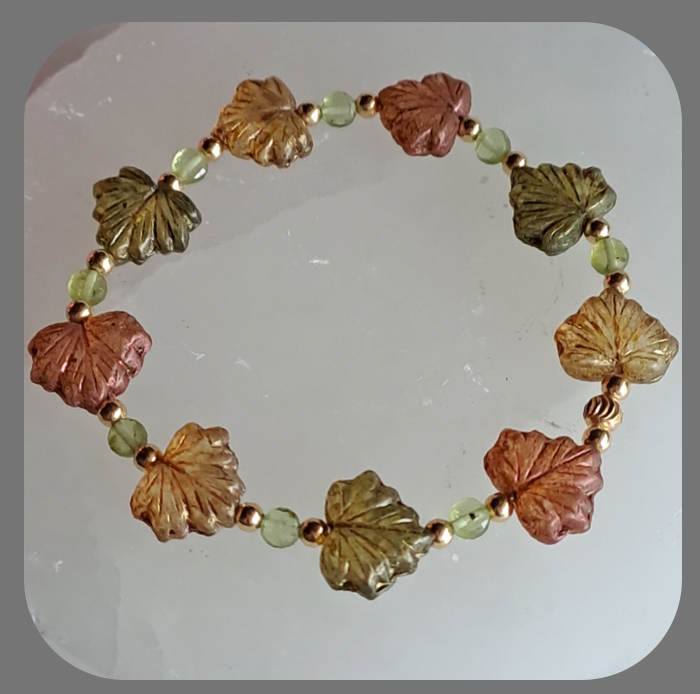 Pretty bracelet made with warm coloured Czech glass leaves, Peridot and vermeil (gold plated sterling silver).