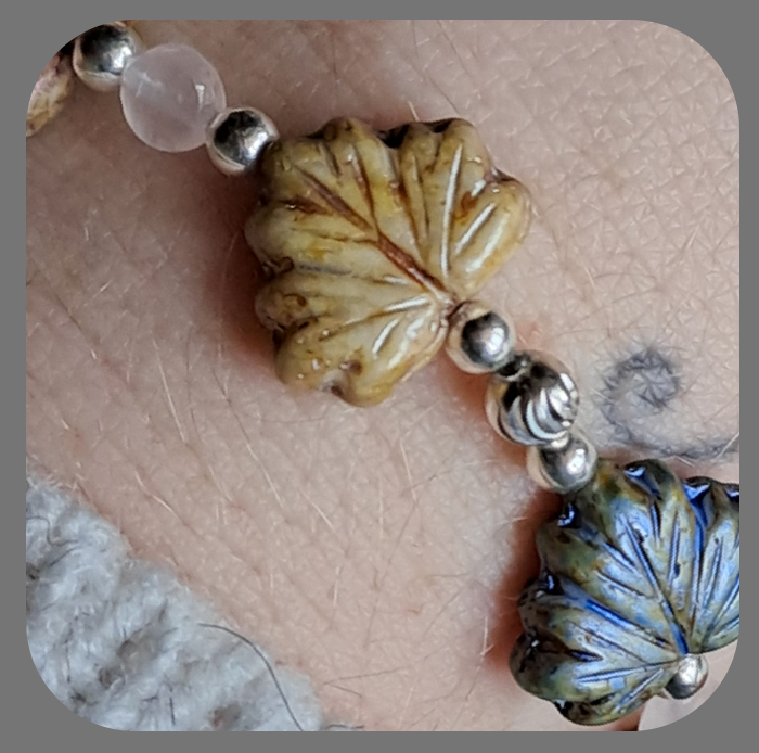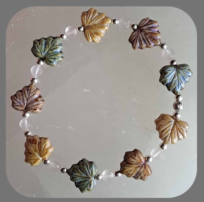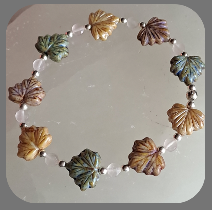 Pretty bracelet made with pastel coloured Czech glass leaves, Rose Quartz and sterling silver.