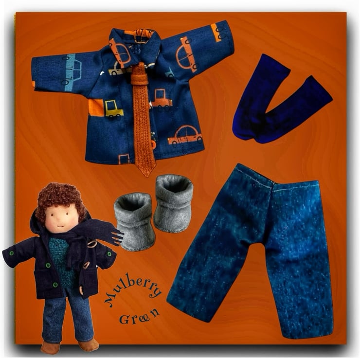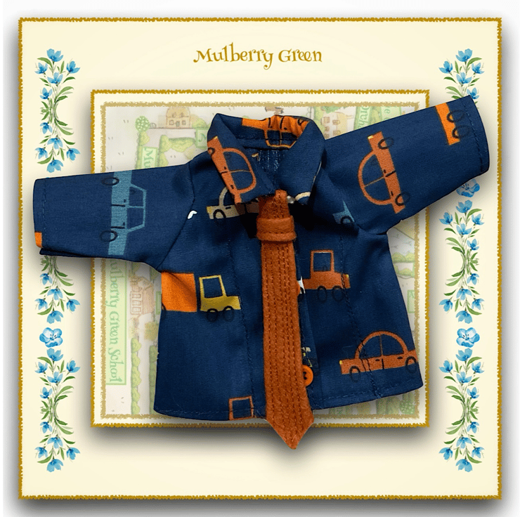 A cute little shirt to fit the Mulberry Green characters. The shirt is made from best quality cotton in a vehicles print and has a matching burnt orange elasticated tie. The shirt fastens with poppers underneath the buttons and looks lovely with the cords or jeans.