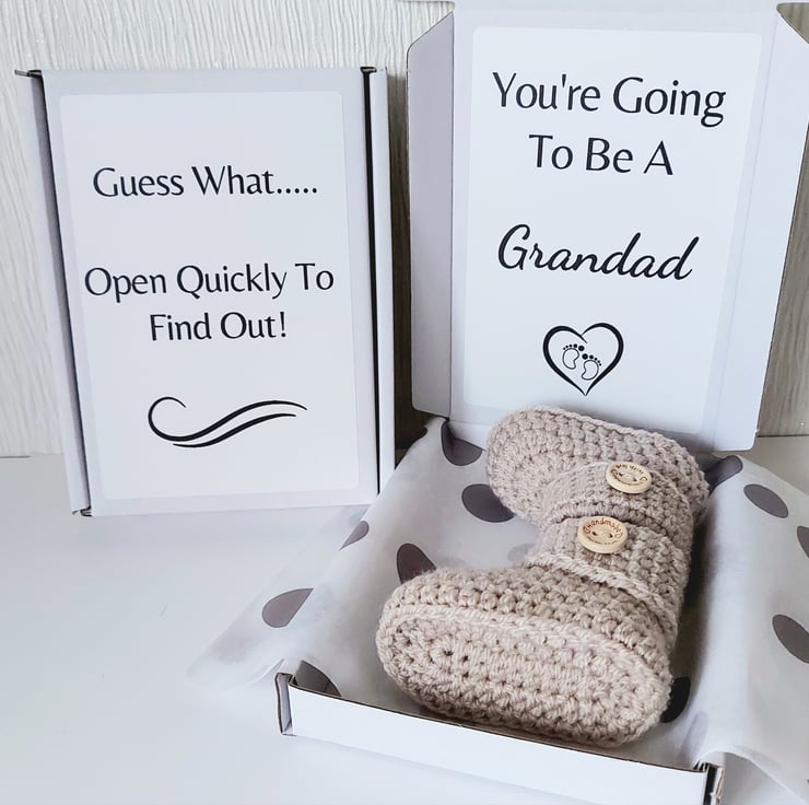 Looking for a unique and heartwarming way to reveal your pregnancy to Nanny or Grandad? These handmade crochet baby booties come beautifully presented in a letterbox-friendly gift box – perfect for a surprise they’ll never forget.