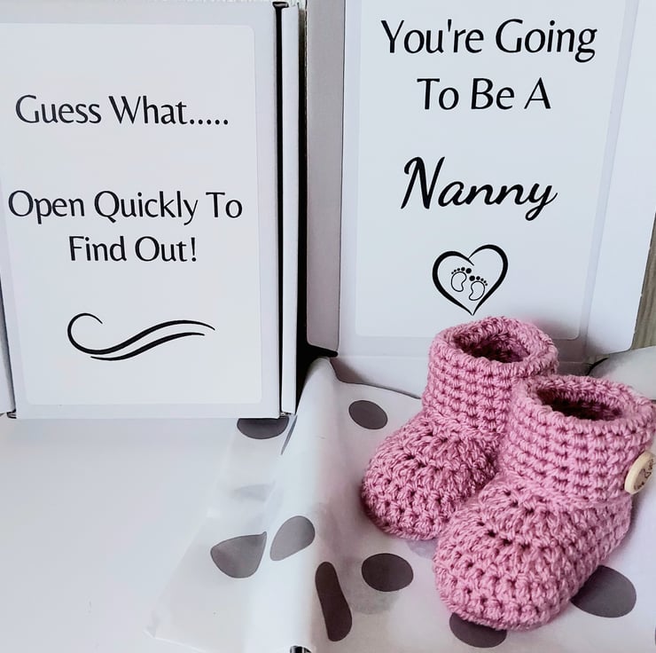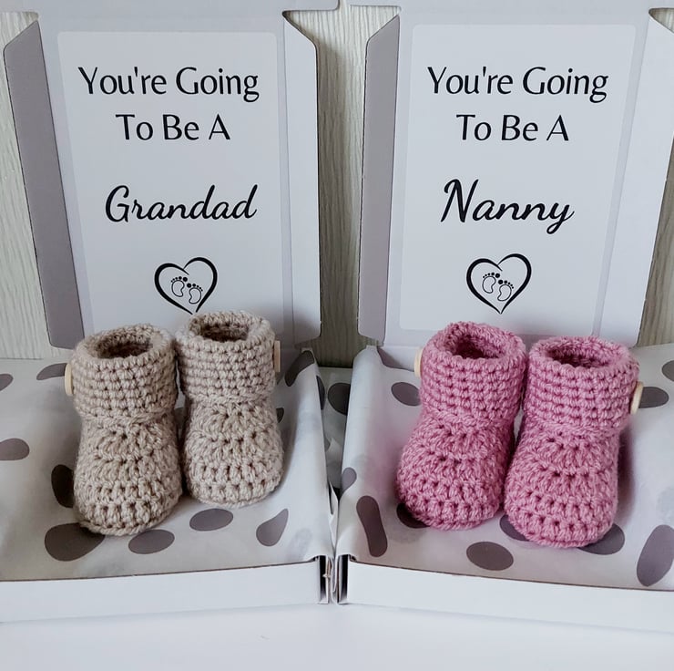 You're Going To Be a Nanny or Grandad – Pregnancy Announcement Gift with Crochet Baby Booties