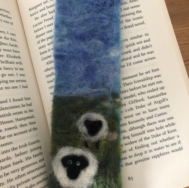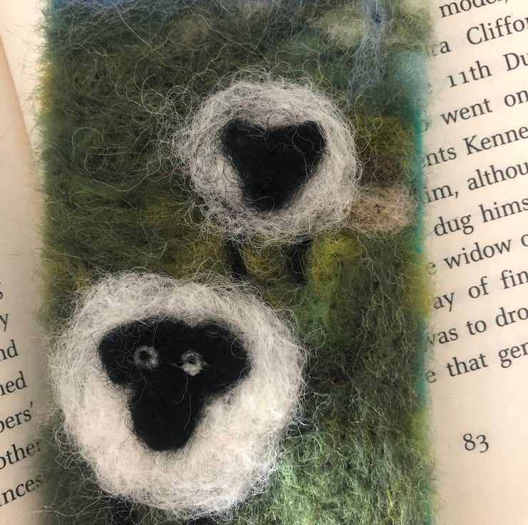 A handmade needle felted bookmark featuring a Ewe and her Lamb. Each bookmark is backed with vintage fabric I found in my loft . Backing fabric colours will vary depending on what I’ve left.