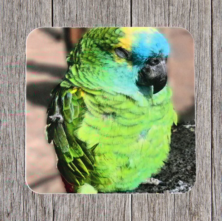 Images are taken from my original photographs. This coaster features a photo taken by me in February 2020 of a Green Parrot having a snooze in the sun on a wall at the sea front in Playa Blanca.