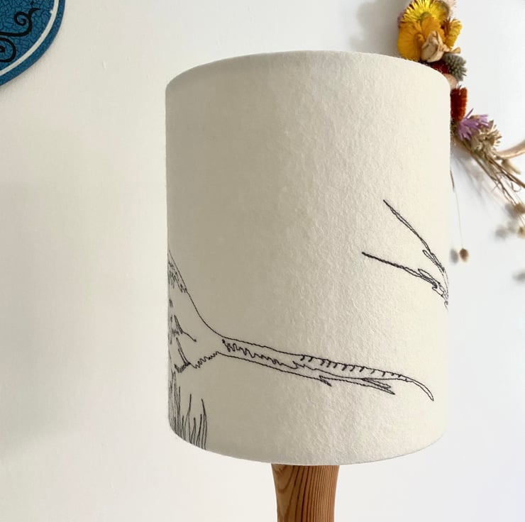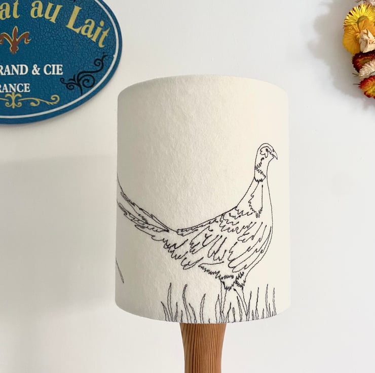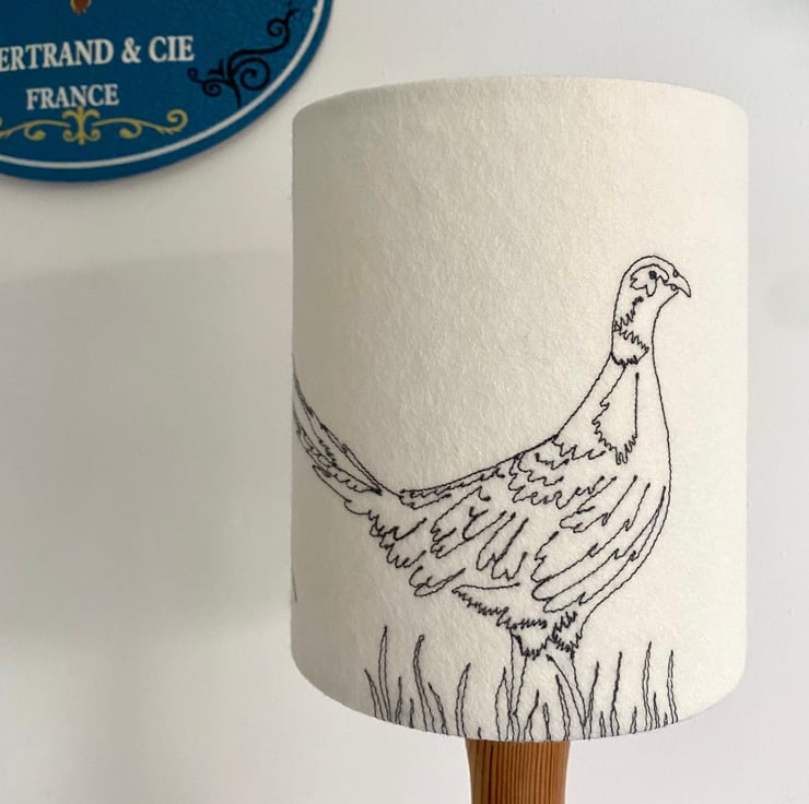 A freehand machine embroidered Pheasant lampshade. A neutral colour felt background using the colour stitch of your choice threads to stitch the design.