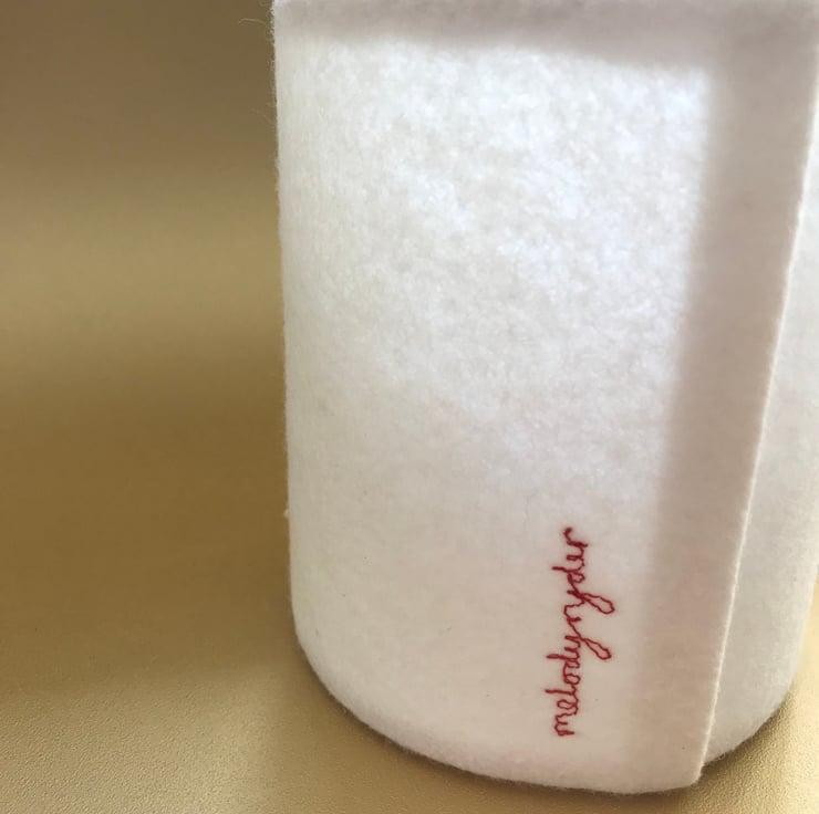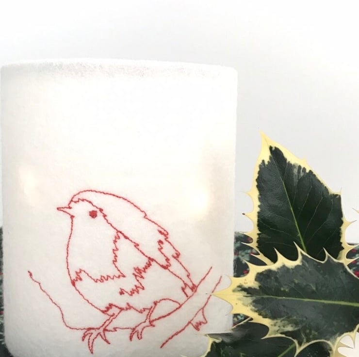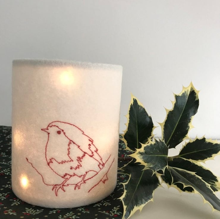 A machine embroidered Robin on a lantern. A neutral felt background using a colour thread of your choice to stitch the Robin.