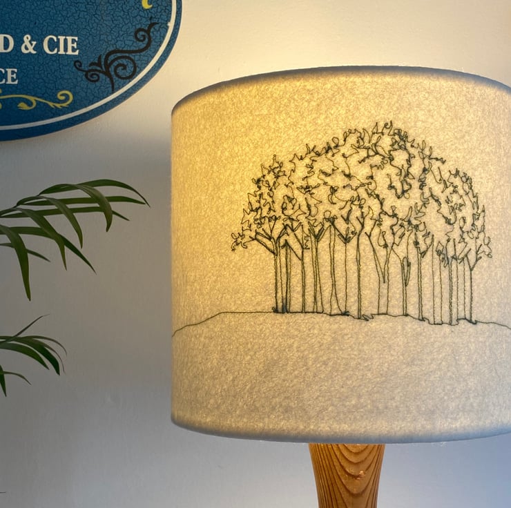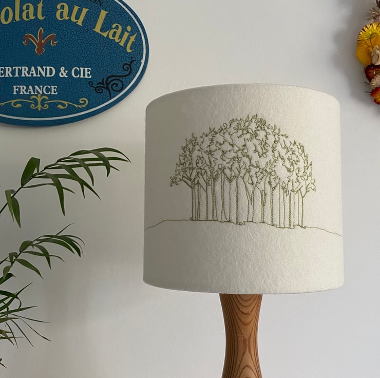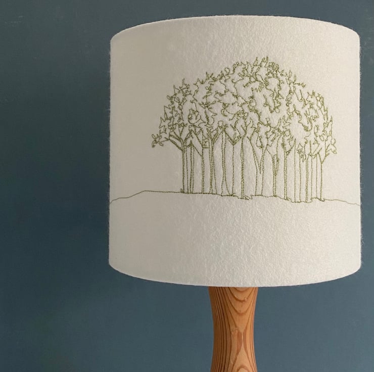 A freehand machine embroidered tree scene of Cookworthy Knapp lampshade. A neutral colour felt background using the colour stitch of your choice threads to stitch my interpretation of the design.