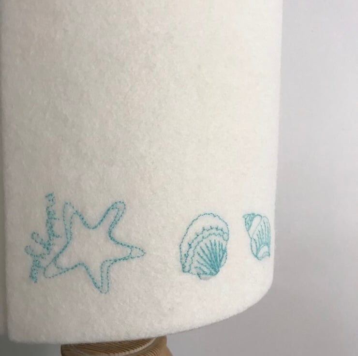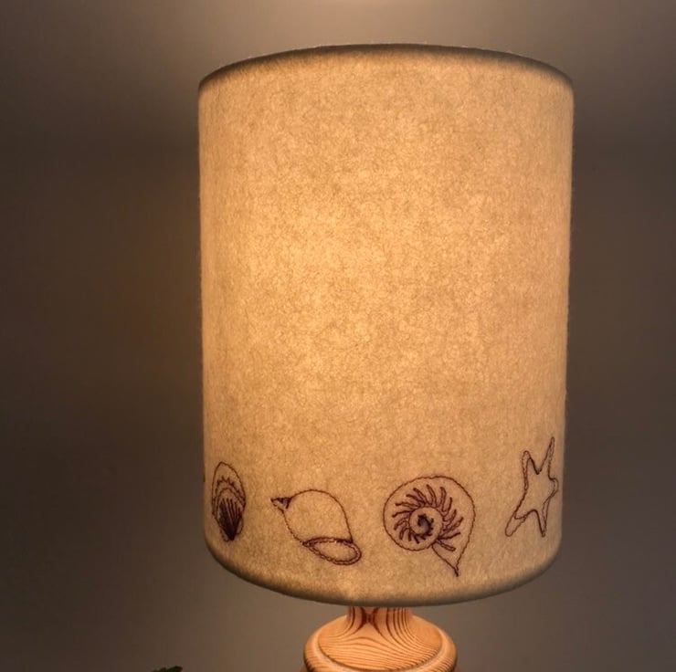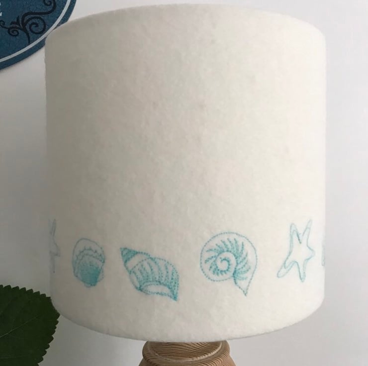 A freehand machine embroidered Seashell lampshade. A neutral colour felt background using the colour stitch of your choice threads to stitch the design.