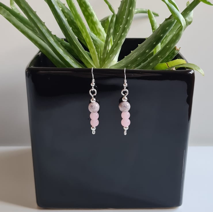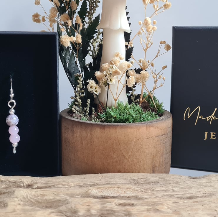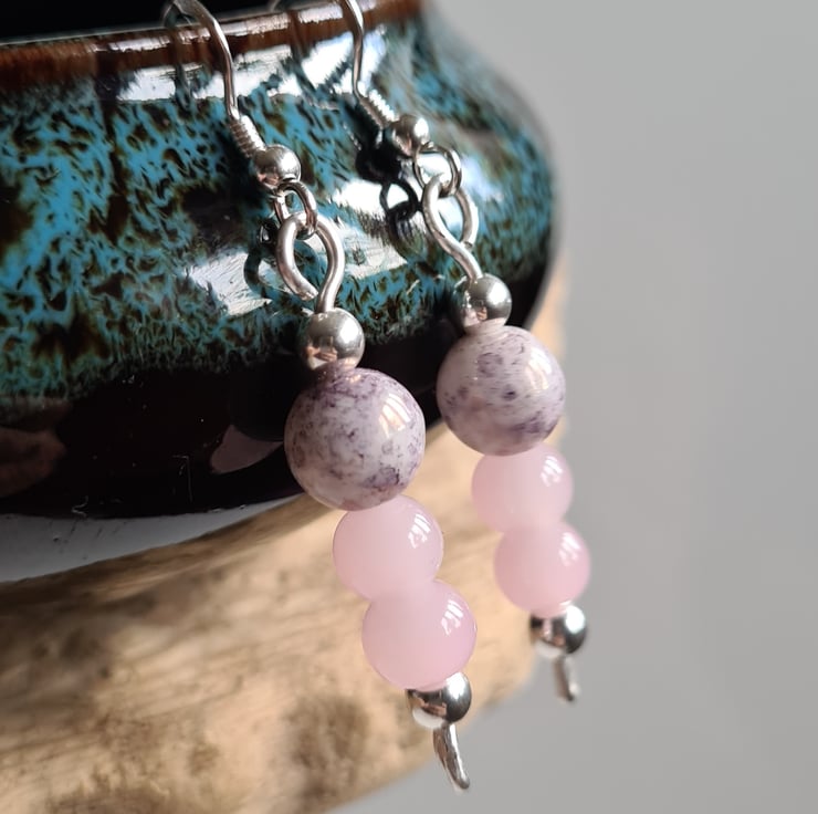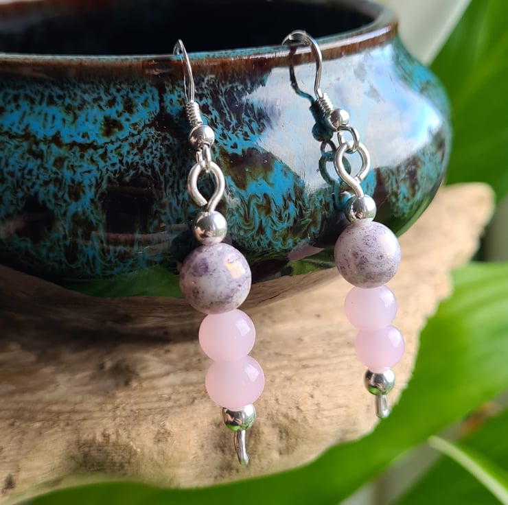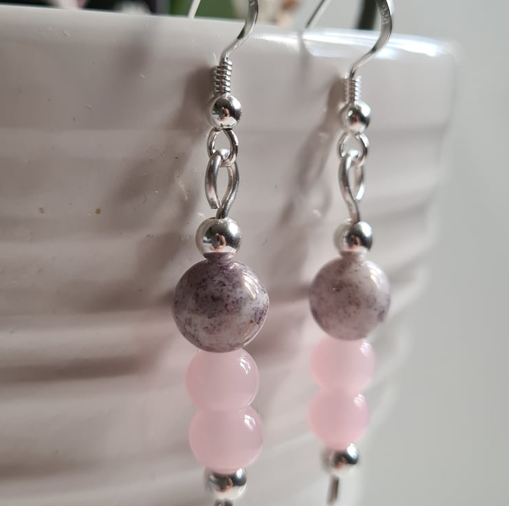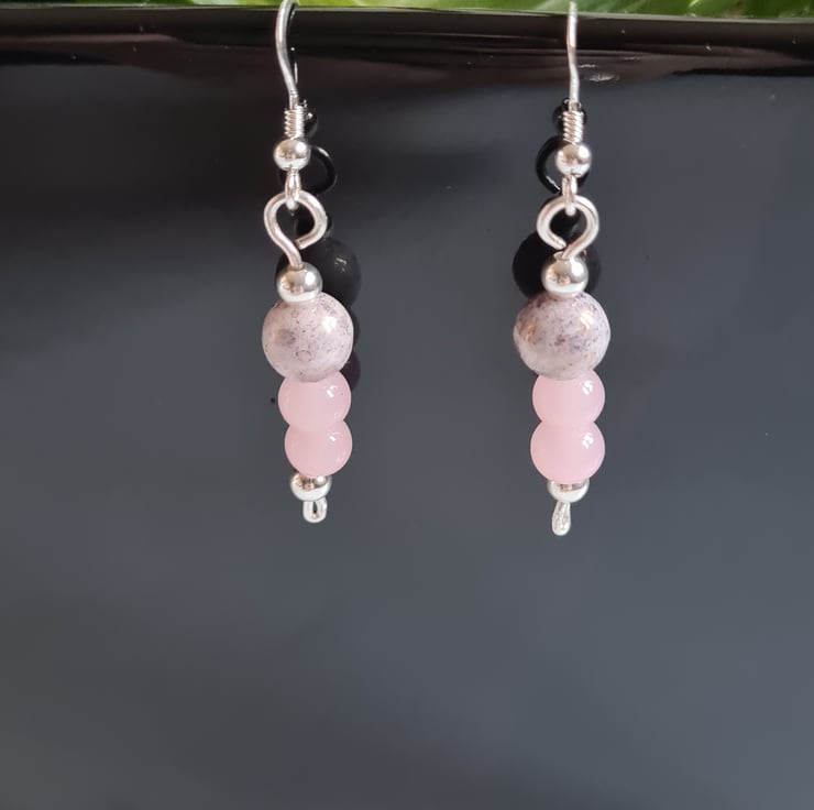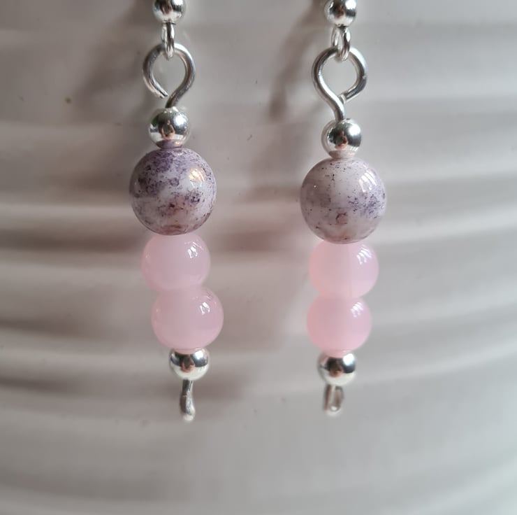 I have created these beautiful earrings fully from 925 Silver and these beautiful pink glass and purple splash ceramic beads, finished with Sterling Silver beads on 925 Silver Ear Bars. These earrings are really cute and would make a great addition to any outfit.