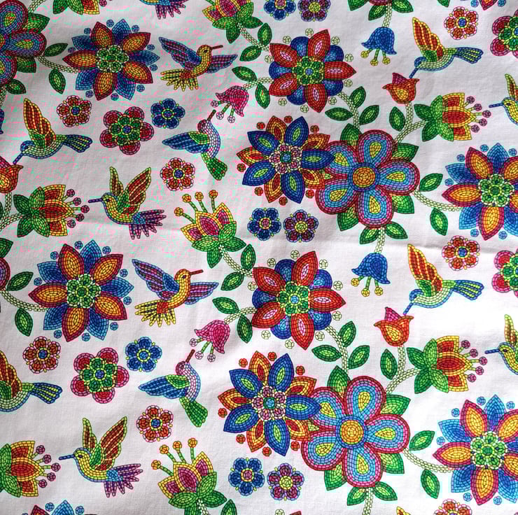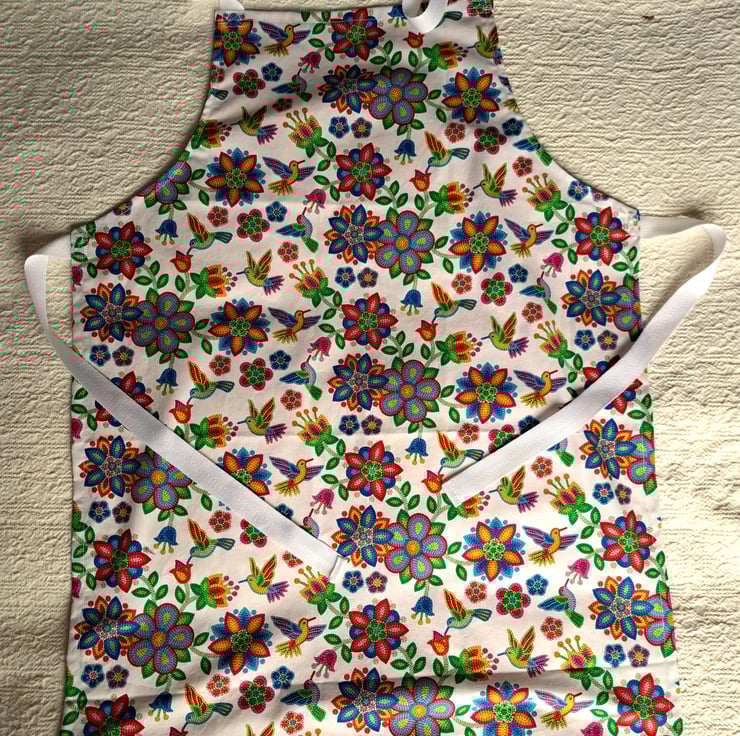 What a lovely generously proportioned white cotton pinafore printed with colourful mosaic flowers and hummingbirds. It is 22" (56cm.) wide at the hem and 30" (76cm.) long, with generous acrylic straps. It is made of good quality quilting cotton and can be machine washed and ironed.
