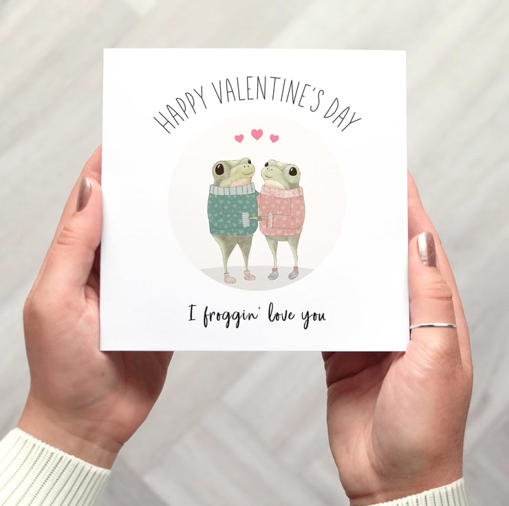 Valentines card features two frogs wearing matching knitted jumpers who are looking at each other and holding hands while standing under 3 love hearts. There is a circular pale yellow background. Card reads Happy Valentines Day I froggin love you.
