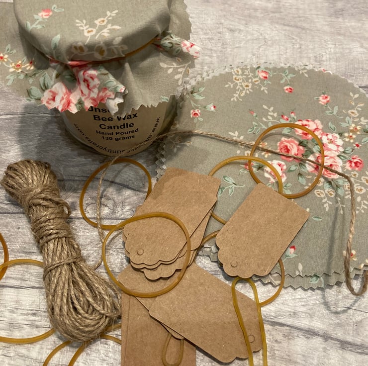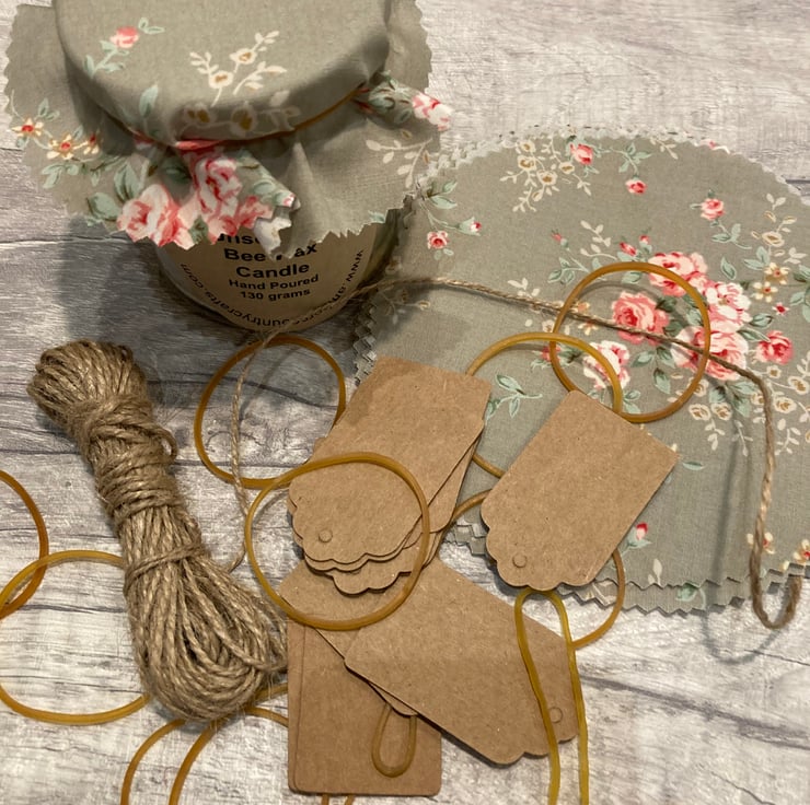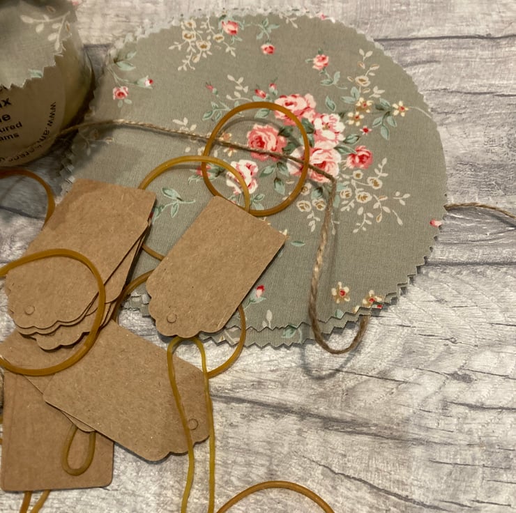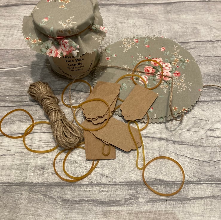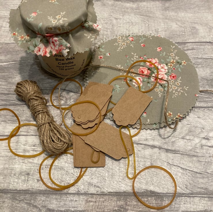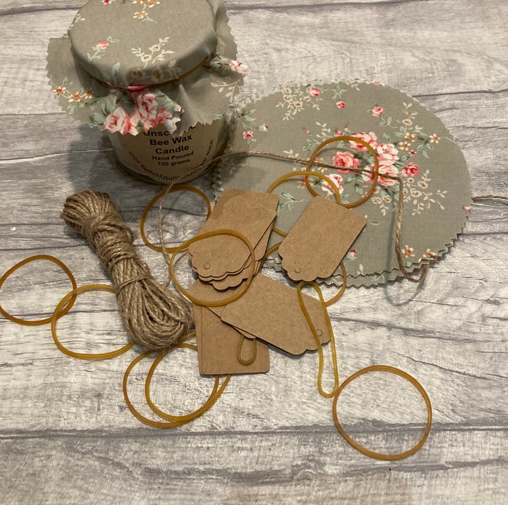 8x Jam jar covers, using Grey Flower Theme fabric , diameter 13 cm