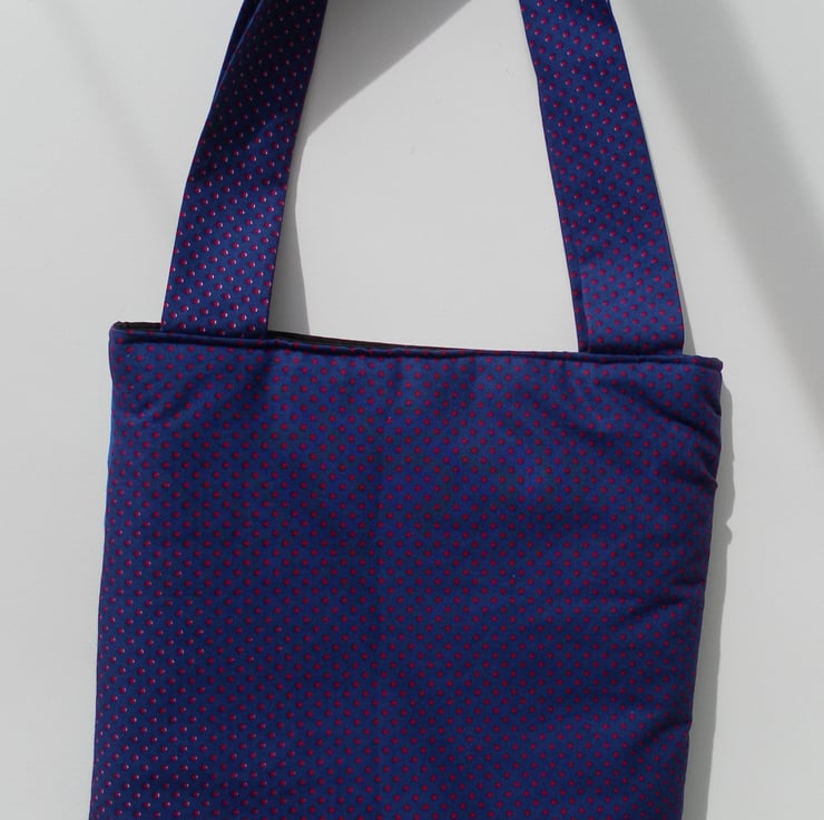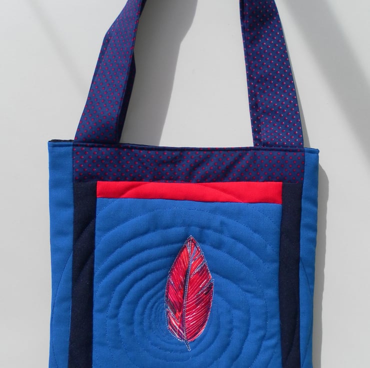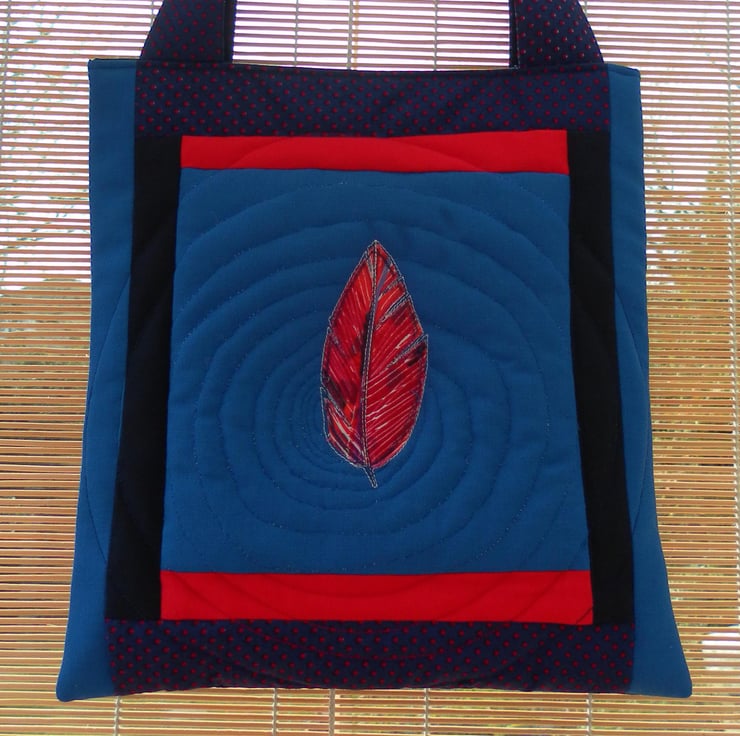 This is a beautiful, quilted, double handled bag. The front of the bag is made from a quilted panel in blues and red with an appliquéd feather motif and ripple effect stitching. The back is blue with red dots and lightly padded. The bag is lined with black cotton and has an internal patch pocket. It has a closure of two press studs and measures 28cm x 27cm, approximately. The two handles are the same fabric as the back and measure 4cm x 52cm, long enough to go over the shoulder if required.