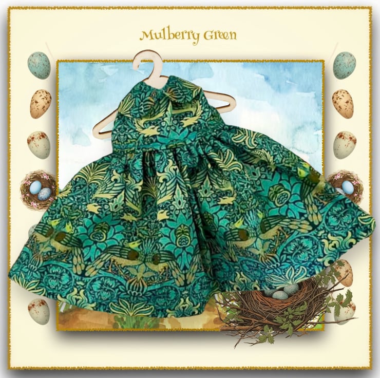 A beautiful little dress in a turquoise and flax peacock print, to fit the Mulberry Green characters. The dress is made from best quality cotton and has a Peter Pan collar and a lined bodice.