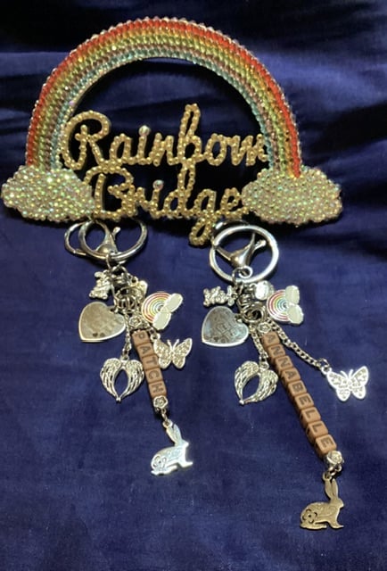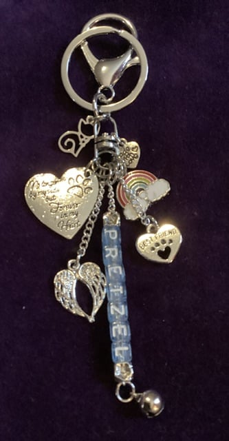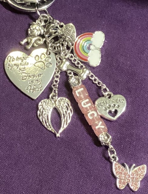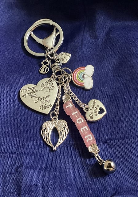The keyring is made from either brown, Blue or Pink square alphabet beads, a tiny silver bell, a silver bone or a butterfly, a pair of filigree angel wings, a silver Best Friend heart paw Charm or similar a rainbow charm, and a sentiment charm, please chose from the 3 below:-
