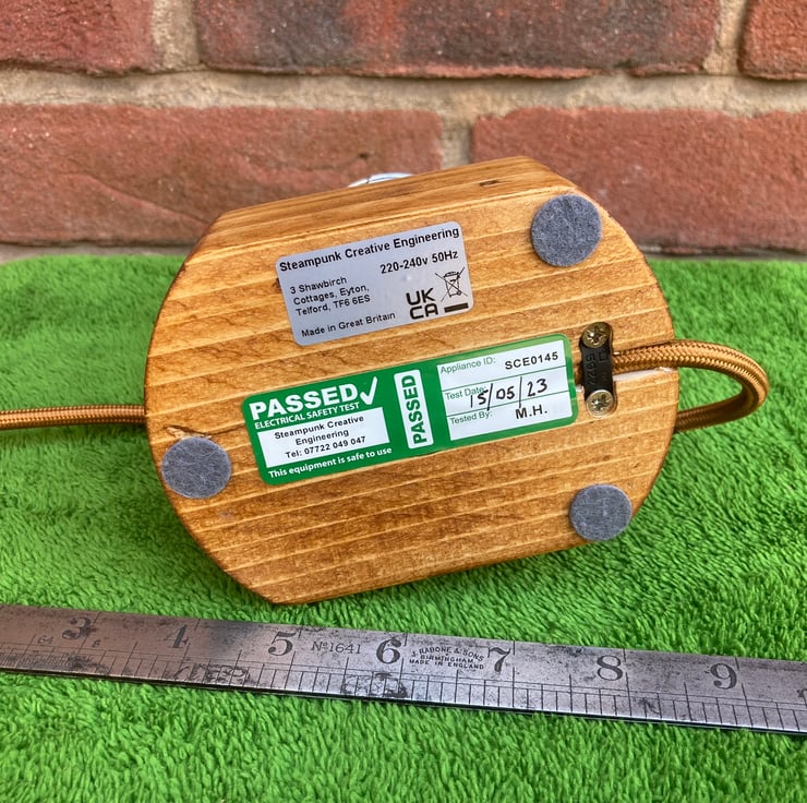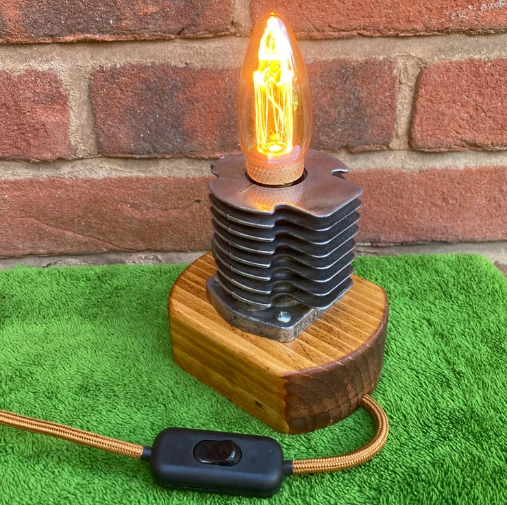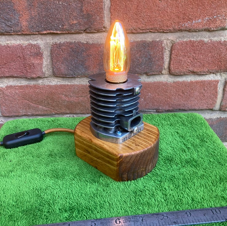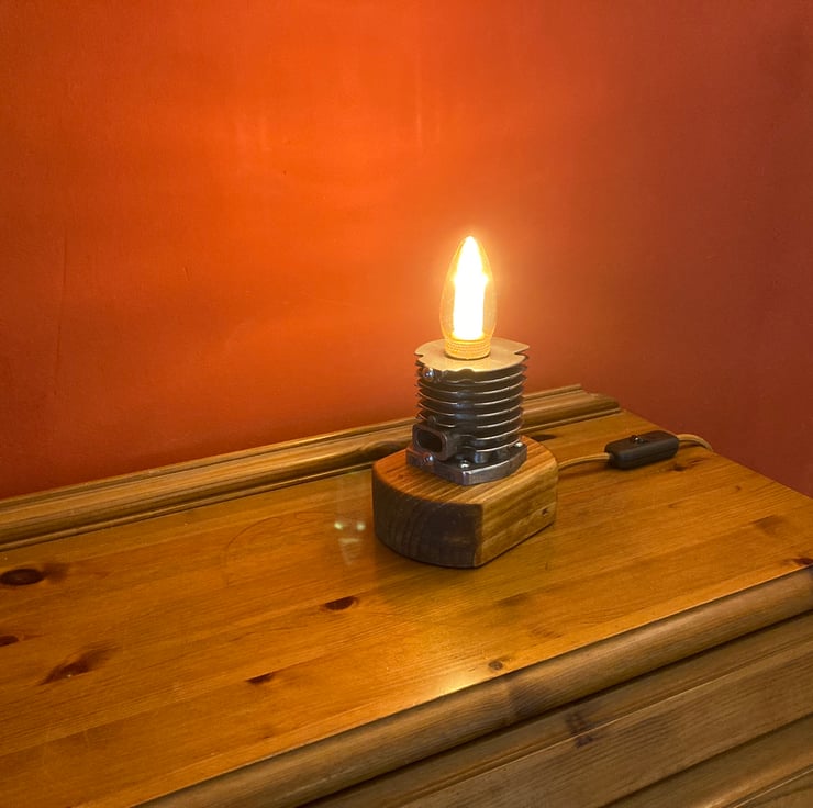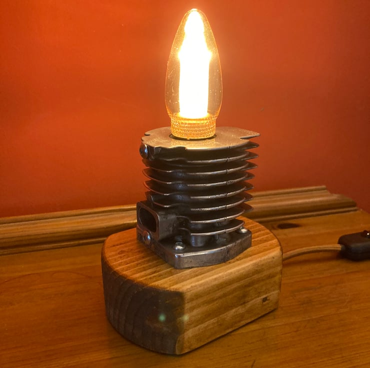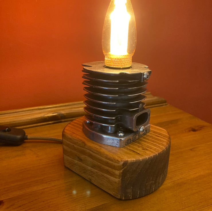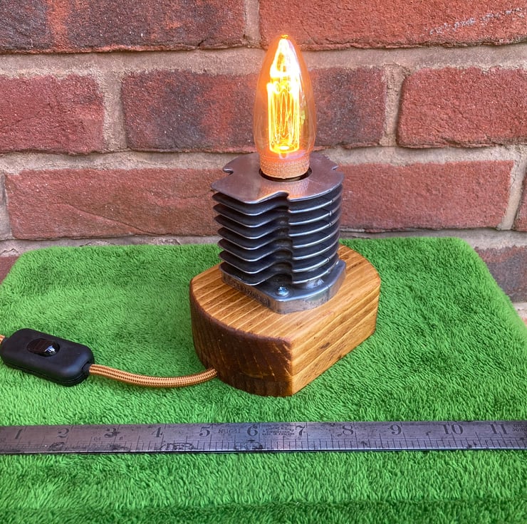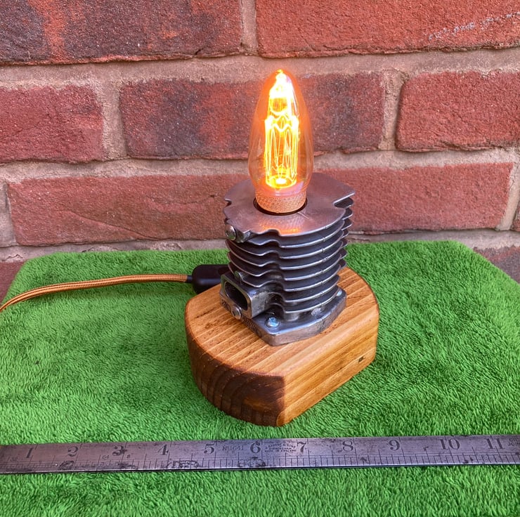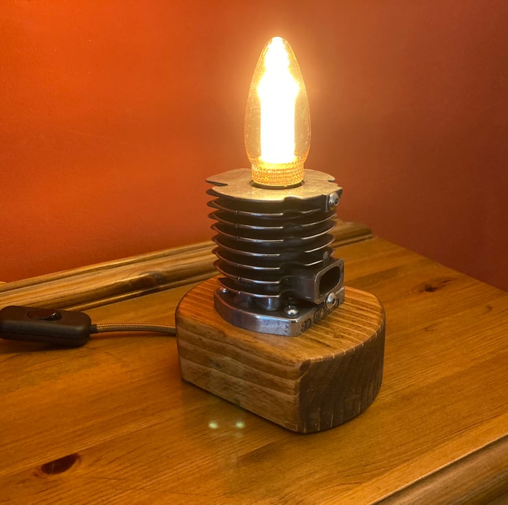 Something industrial and quirky to illuminate your home, an unusual and decorative table lamp with a squirrel cage LED bulb, based around an engine cylinder removed from an old 2-stroke petrol strimmer. The cylinder, taken from a strimmer engine by a well-known and respected German manufacturer, has been bored out on my lathe to conceal an SES lampholder inside so that just the glass of the SES candle bulb shows. I then polished the cylinder fin edges up to an attractive shine before mounting it firmly onto a reclaimed wood base which has been sanded, stained and treated with French polish to give it a fine finish. Power is supplied through two metres (over 6 feet) of antique gold fabric braided flex fitted with a black inline switch and black 3-amp fused UK plug. As always from Steampunk Creative Engineering, all electrical components are brand new and the unit is safety tested and certified as UKCA compliant.