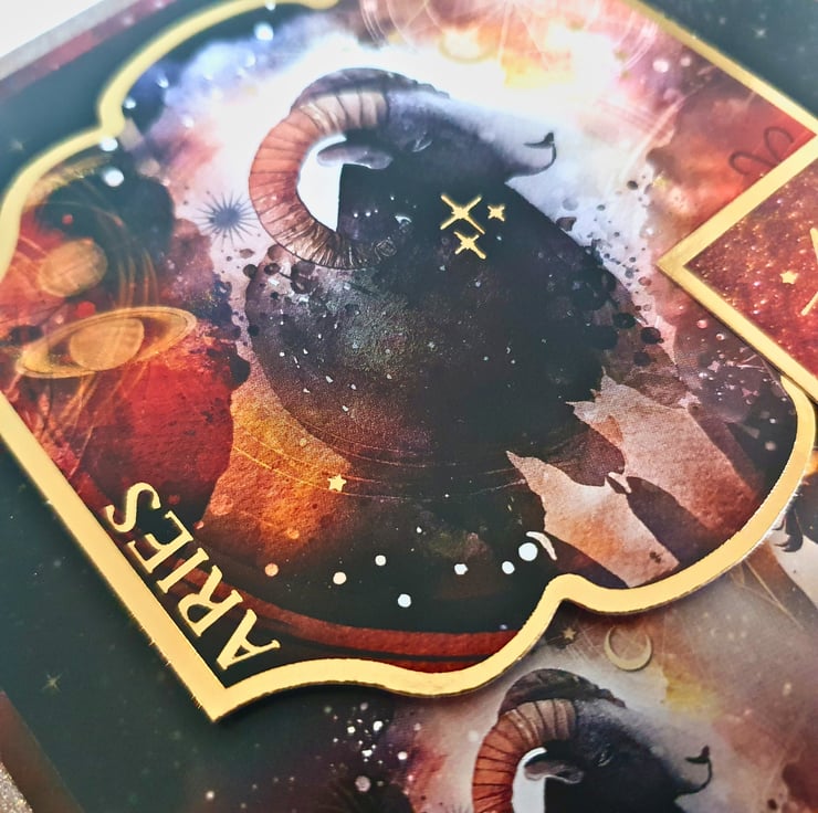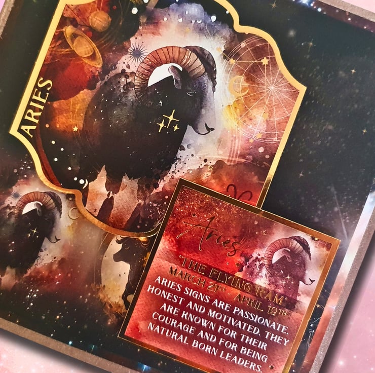 The card consists of mats & layers of patterned paper, patterned cardstock & gold foiled toppers, all in zodiac theme.