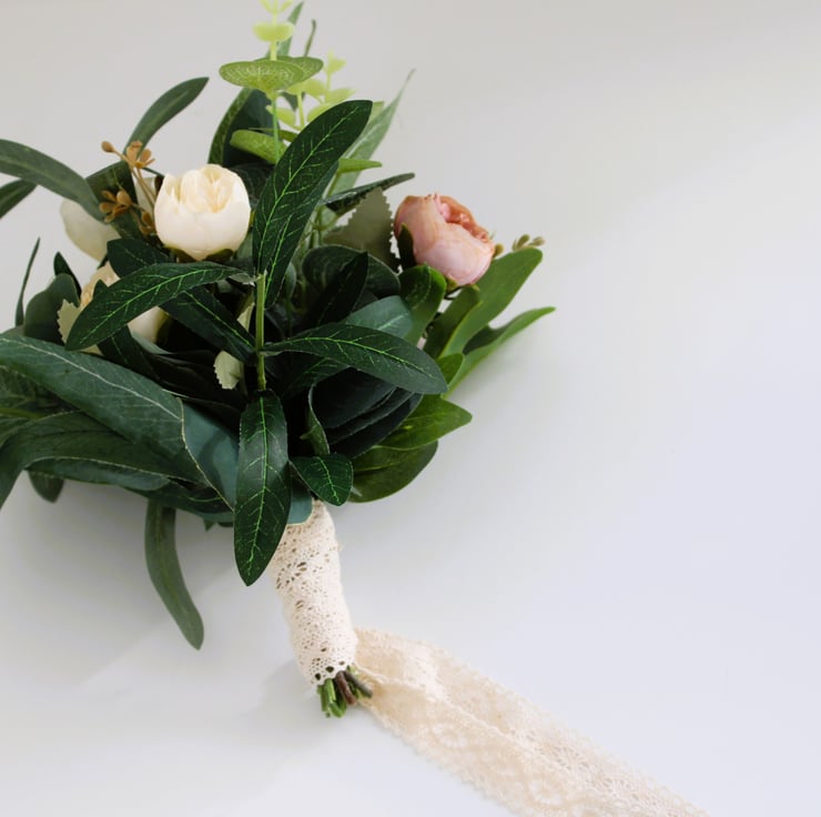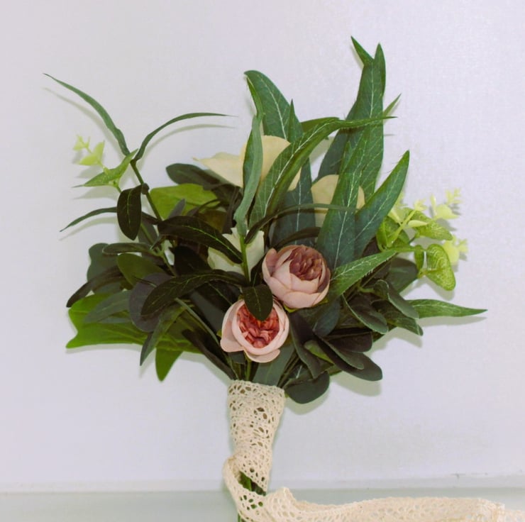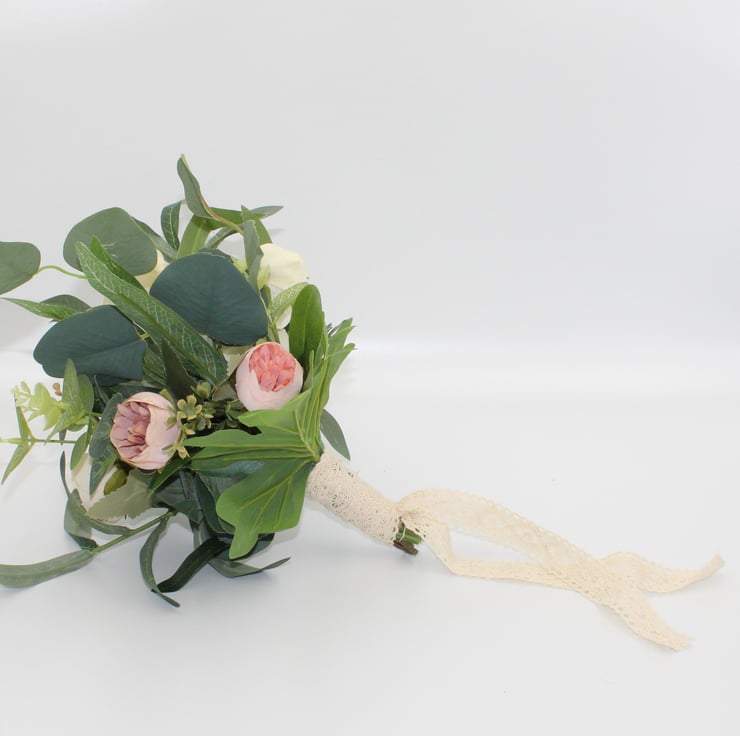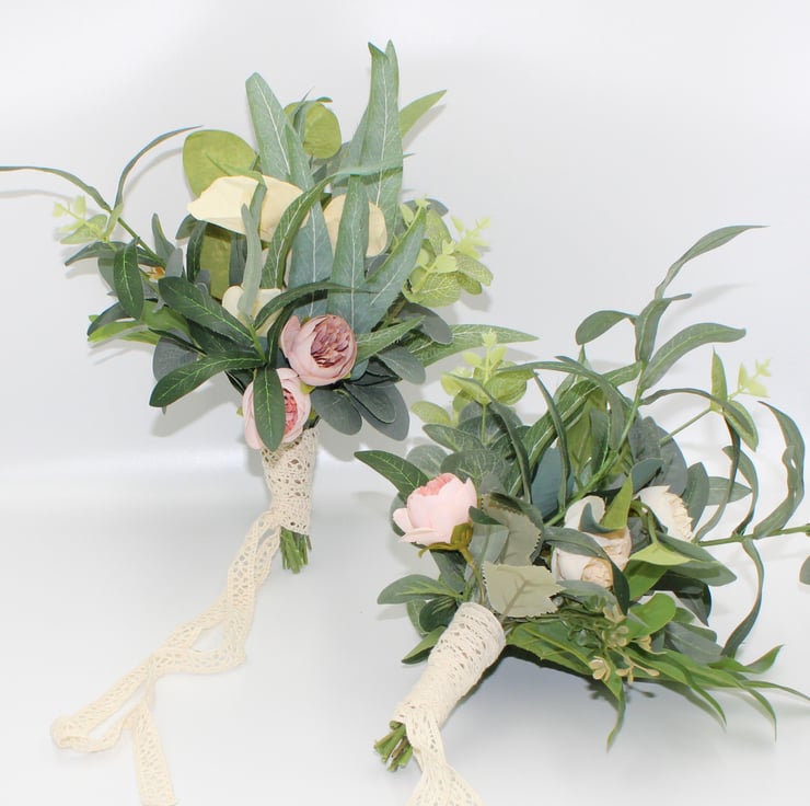 Flower girl or bridesmaid bouquets in pinks and cream coloured faux flowers with a variety of green foliage, including eucalyptus and olive tree leaves, finished with a crochet ribbon.