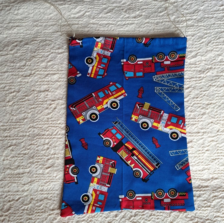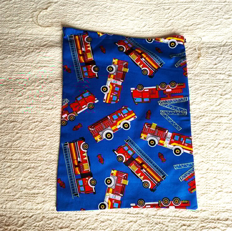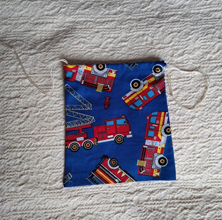 Here are four lovely reusable cotton drawstring bags, made from good quality quilting fabric. They are beautifully printed with scarlet fire engines against a royal blue background. The largest measures a generous 12" (31cm.) by 9" (22cm.), the medium ones 10" (26cm.) by 7" (18cm.) and 8" (21cm.) by 5" (13cm.) and the smallest 6" ( (16cm.)" by 5.5" (14cm.). All these sizes are approximate. The bags can be machine washed, ironed and reused many times.