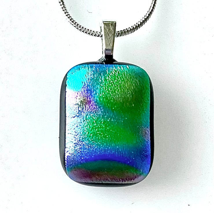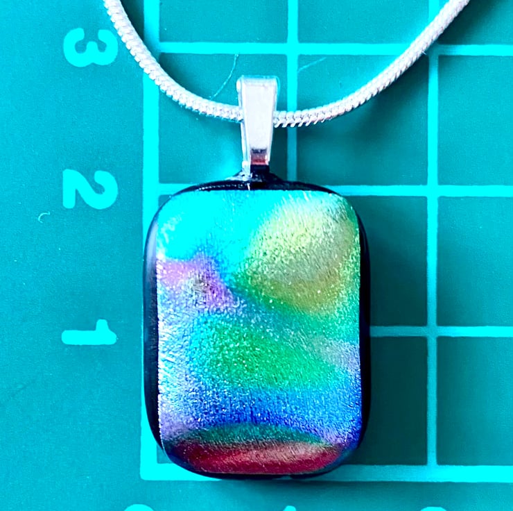 This hand-cut multicoloured glass pendant was made by fusing a layer of corkscrew patterned dichroic glass to a black base layer to create this stunning multicoloured shimmering pendant. The shimmer is a matt finish rather than glossy. It was fired at 800 degrees Celsius in a specialist glass kiln and gently cooled over a 12 hour period. A silver plated jewellery bail was glued on to the back to hang it on an 18 inch silver plated snake chain or black cord. It measures approximately 15mm across and 19mm high.