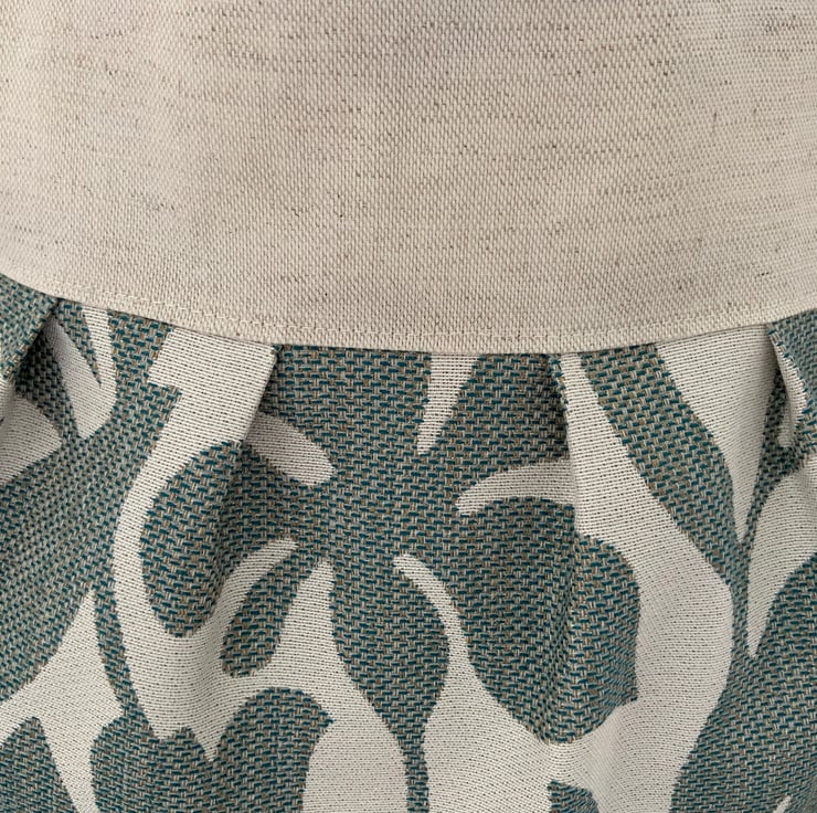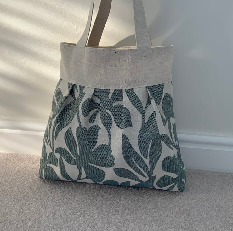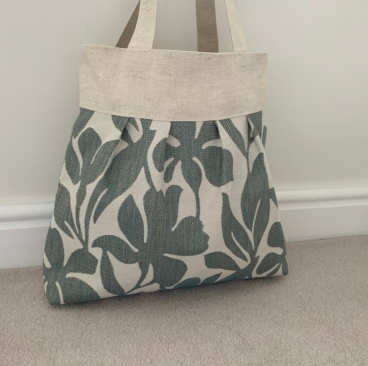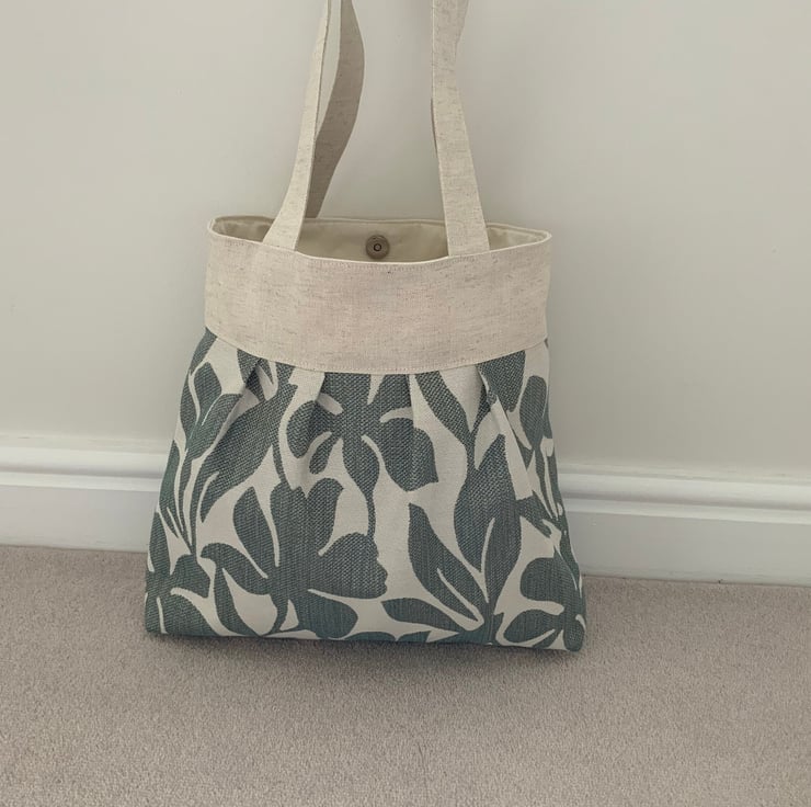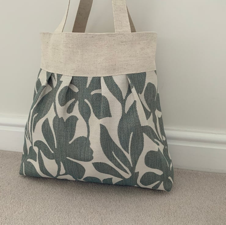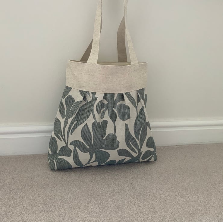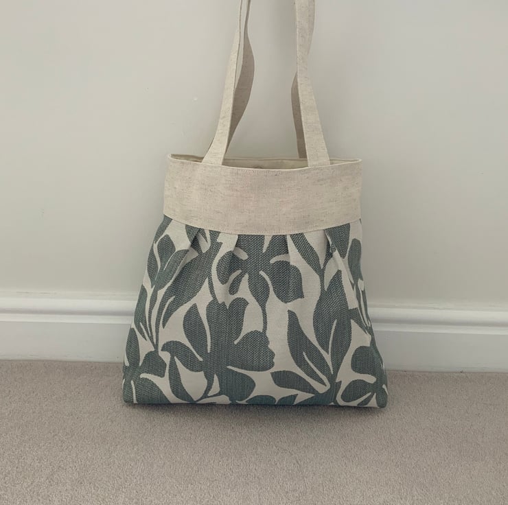 Beautiful pleated tote bag. Natural linen band at top with a pleated quality patterned fabric beneath. It is lined with natural colour cotton and sandwiched in between is a layer of interlining to give it structure and a soft luxurious feel. Internally, it has a small slip pocket and is fitted with a magnetic snap fastener. The square bottom gives the bag extra depth.