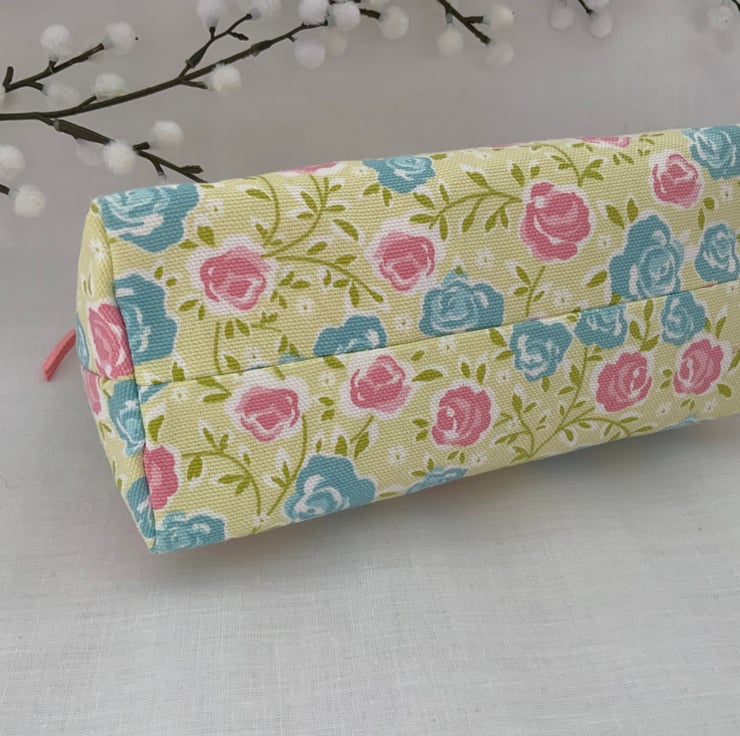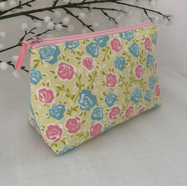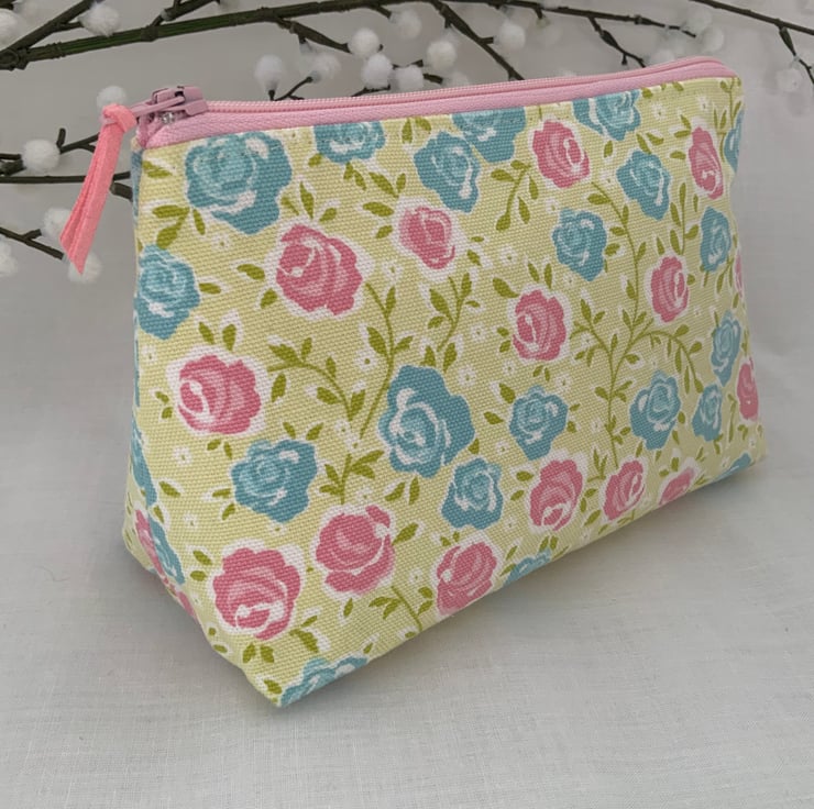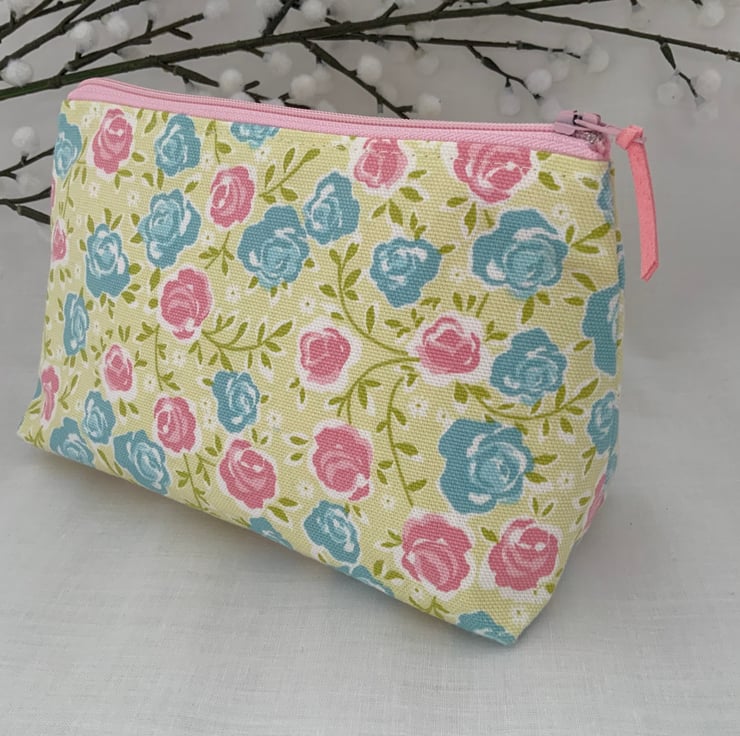 Beautiful square bottomed zipped cosmetic bags pouch purse made from 100% cotton fabric and lined with coordinating cotton and interfaced to give it a little structure.