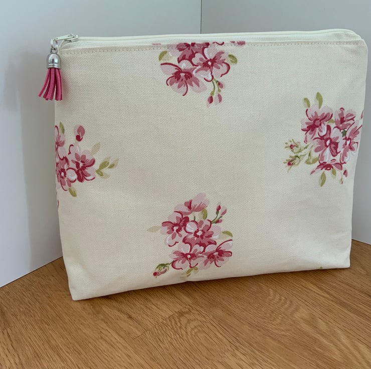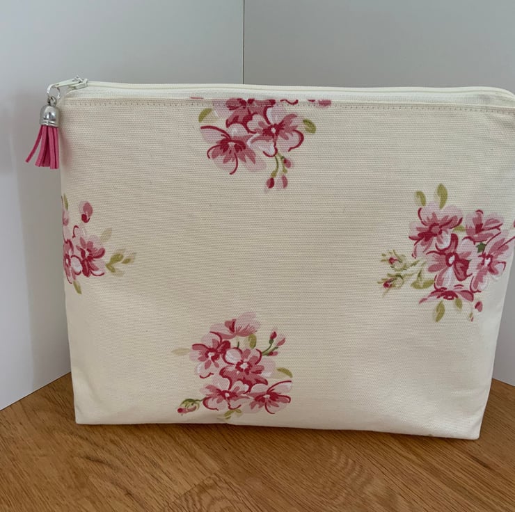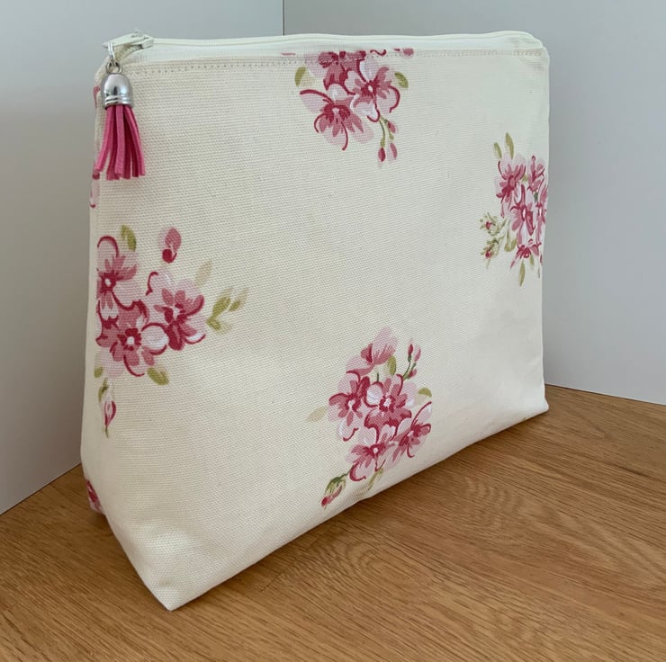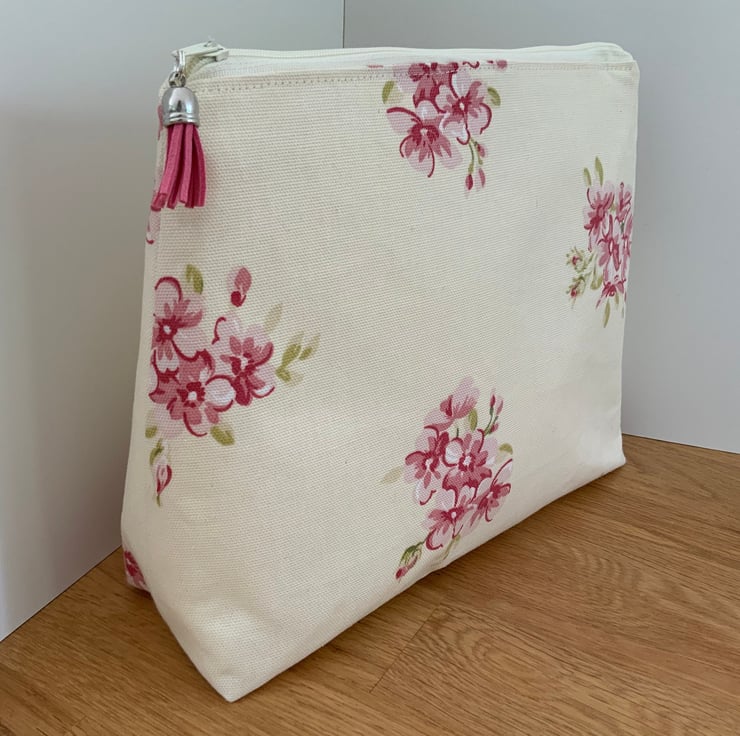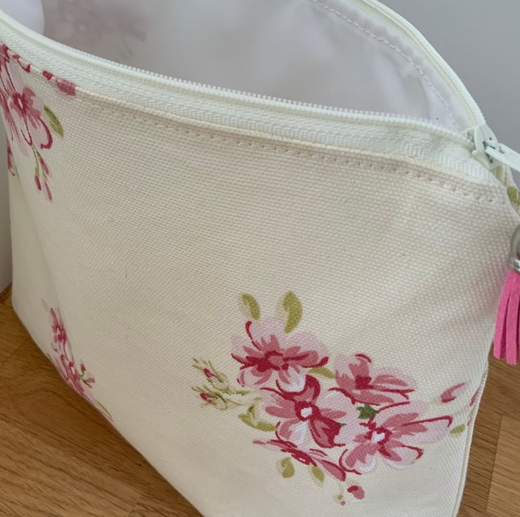 A gorgeous wash bag perfect for storing your toiletries or cosmetics. It would look stylish on display in a bathroom or on a dressing table but also perfect as a travel accessory to carry your toiletries or cosmetics. This bag is interfaced to give it structure and is lined with a white waterproof fabric. The zip is finished with a matching tassel.