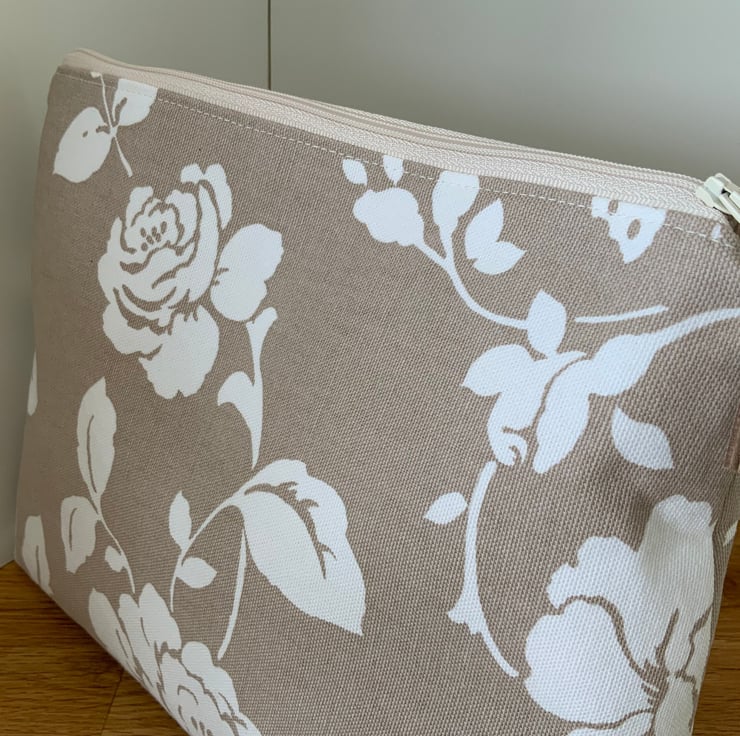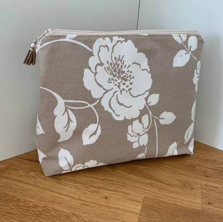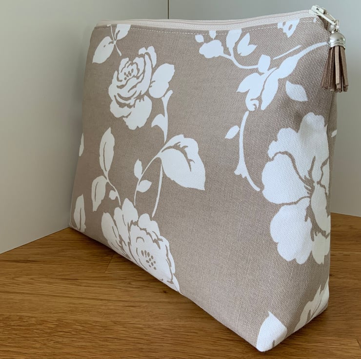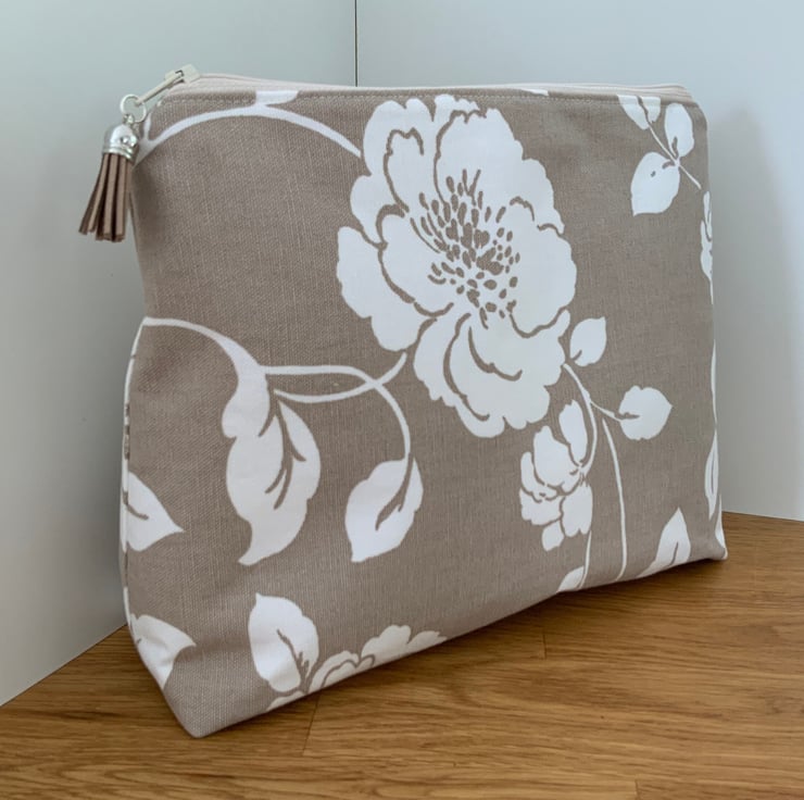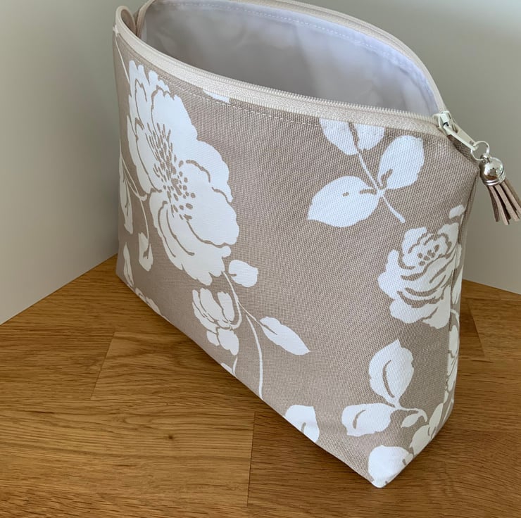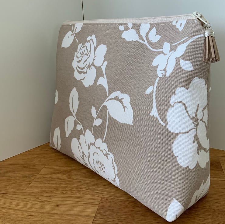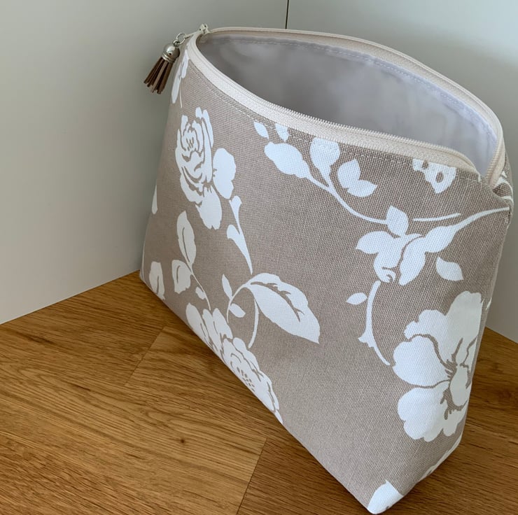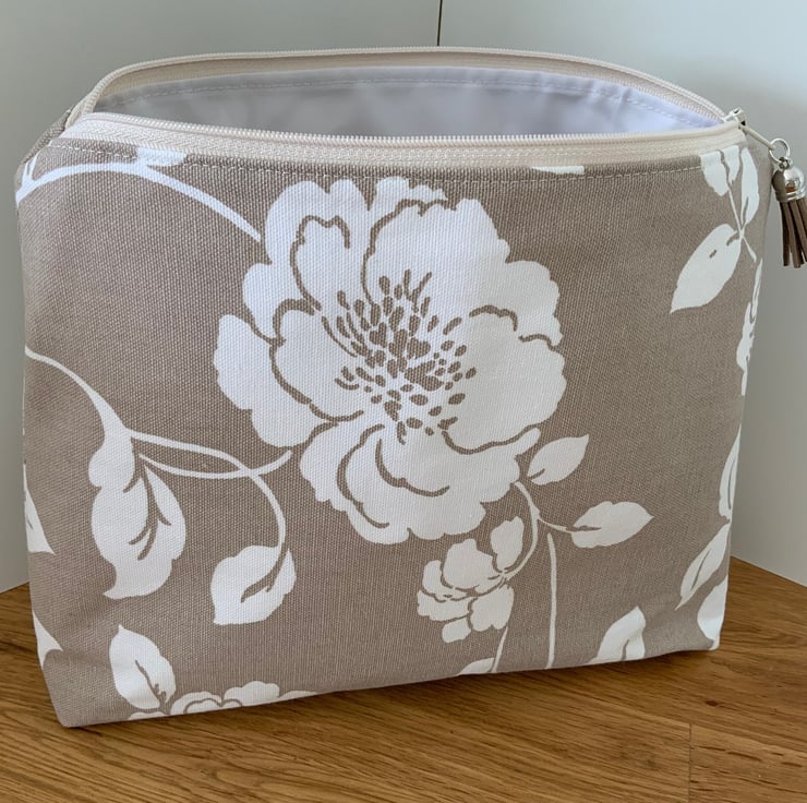 A gorgeous wash bag perfect for storing your toiletries or cosmetics. It would look stylish on display in a bathroom or on a dressing table but also perfect as a travel accessory to carry your toiletries or cosmetics. This bag is interfaced to give it structure and is lined with a white waterproof fabric. The zip is finished with a matching tassel.