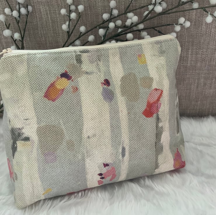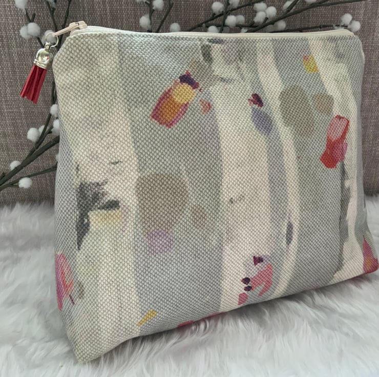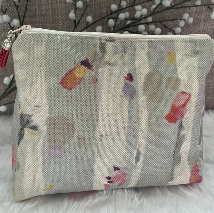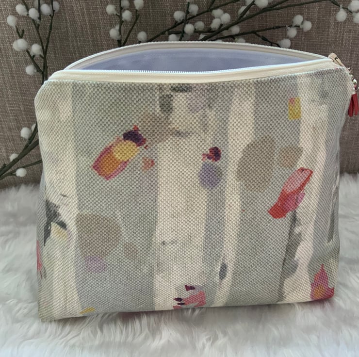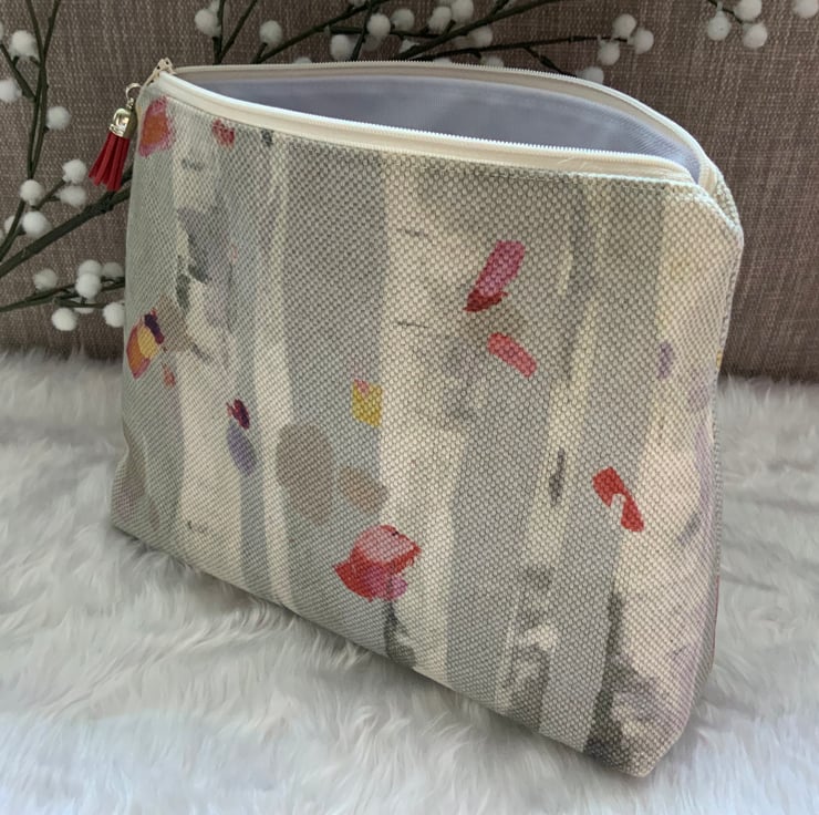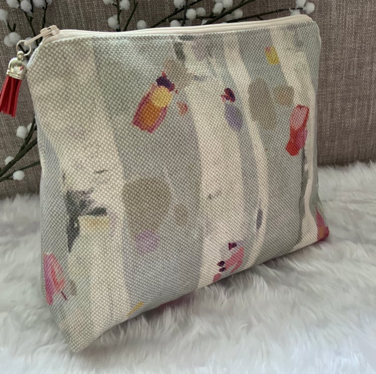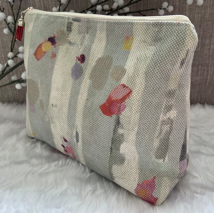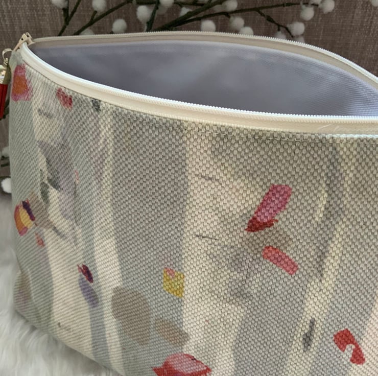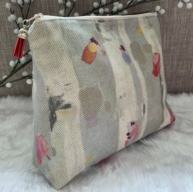 A gorgeous wash bag, perfect for storing your toiletries or cosmetics. It would look stylish on display in a bathroom or on a dressing table but also perfect as a travel accessory to carry your toiletries. This bag is lightly interfaced and is lined with a white waterproof fabric. The zip is finished with a matching tassel.